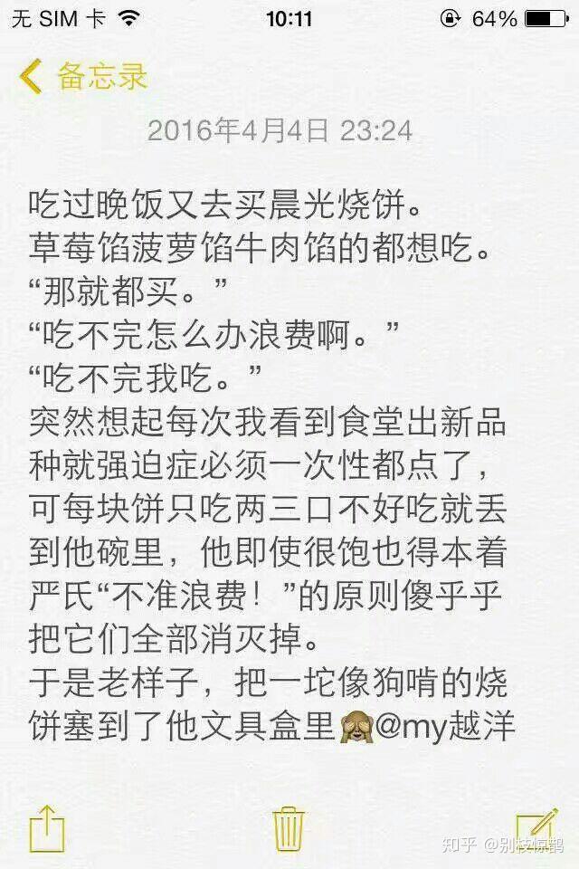 他不仅给我编了好多条,还给我妈编了好多条哈哈哈哈哈幼稚得可爱30.每周日下午 ,我在阅览室看书 ,他在球场打球, 然后五点半我们在操场国旗下集合。 一起去吃豆腐脑。 我有时候看书看累了也会出来散步散到球场, 坐在旁边看他打会儿球, 我们都特别喜欢豆腐脑 (后来发现不仅都爱吃豆腐脑,几乎所有饮食习惯都惊人的相似,对辣的承受能力也一样,所以从来没有在饮食上有过分歧,除非他要去的餐厅我觉得贵要念叨他几句哈哈哈哈),一起发现了一家特别不起眼的豆腐脑小摊子。傍晚两个人坐在路边的小板凳上吃豆腐脑 ,他教我最美味的搅拌方法哈哈哈, 特别满足。 后来一起去其他省市排队吃过好多网红店里的豆腐脑都没有那个路边摊的香。