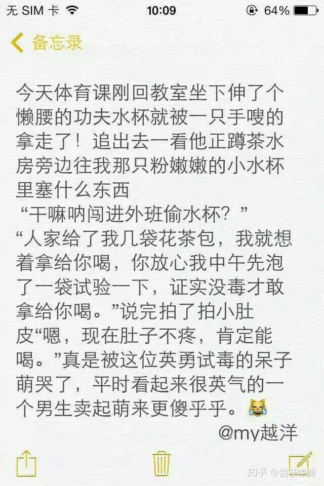 告白第二天他来我们班跟我借语文书 ,糊里糊涂把书借给他 ,忘记了自己下一节也是语文课 ,他把书还来的时候里面工工整整用铅笔记着笔记, 便利贴上备注:如果嫌字丑就可以擦掉。还有一张书签 ,眉头:For我的小太阳,中间写着“日子过得很灿烂 因为心中有阳光。”一直被他用作朋友圈签名。