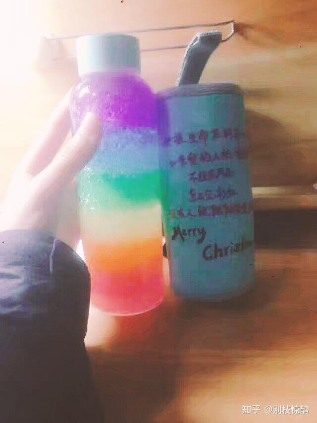 他做的彩虹瓶 但手机像素太渣看不清分层和抄在杯套上的《追梦赤子心》歌词了