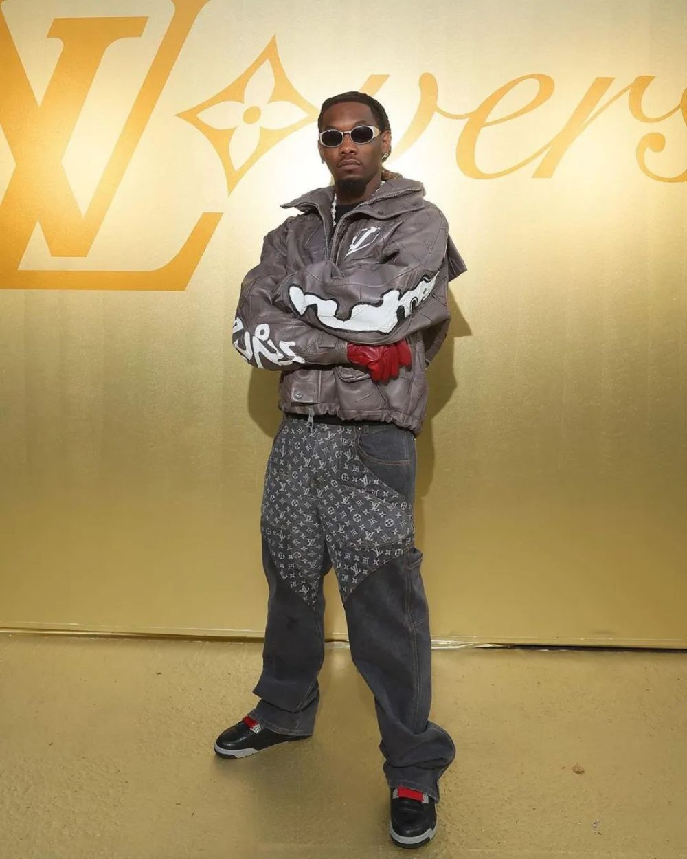 外套与裤装依旧是 LV 的新款毕竟人家的地盘,穿别的牌子舒适不合适,但脚上这双「黑镭射」Air Jordan 4 还是成功吸引了小编的目光。