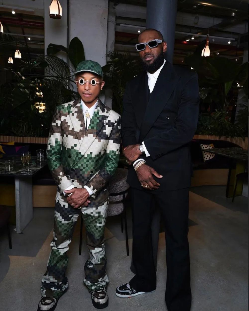 詹姆斯也携詹嫂去到了现场,而且少见的穿了一双黑水泥 Louis Vuitton Trainer,搭配黑色缎面定制西服套装和满钻墨镜,尽显霸气。