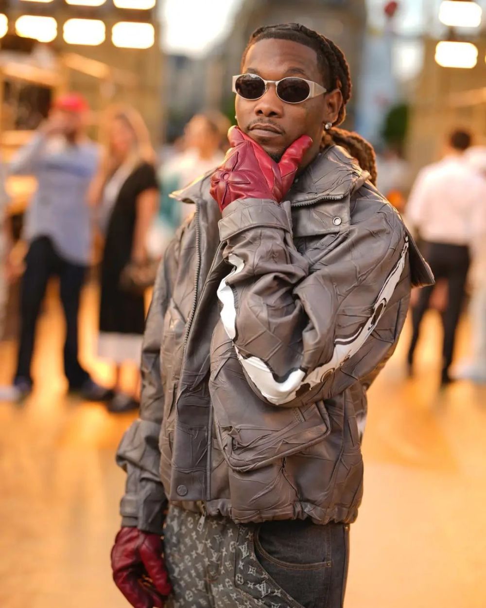 在这个几乎全都是皮鞋、奢侈品运动鞋的大秀场中,卡子姐老公 Offset 仿佛一股清流。