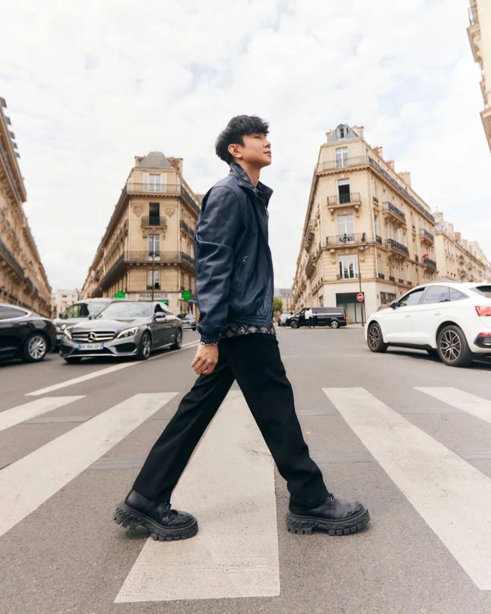 鞋款选择了一双 Louis Vuitton 最新的黑色浮雕皮鞋,不仅增高还能为整身搭配丰富细节。