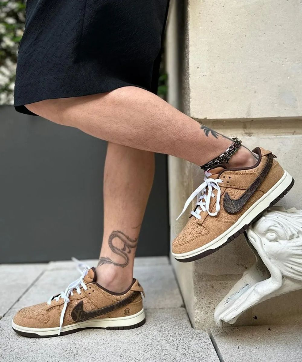 脚上必然是刚刚发售的「软木塞」CLOT x Nike Dunk Low,还将侧身 Swoosh 改为了 LV 老花皮革。