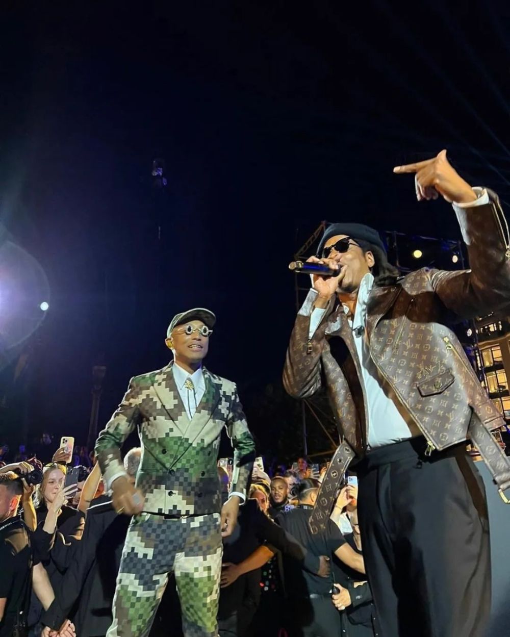 演出中还上身了一件 Louis Vuitton 满印老花皮衣,价格在 ¥5w - ¥6w 之间,但仔细看你会发现在这件衣服的腰间写有 JAY-Z 字样......