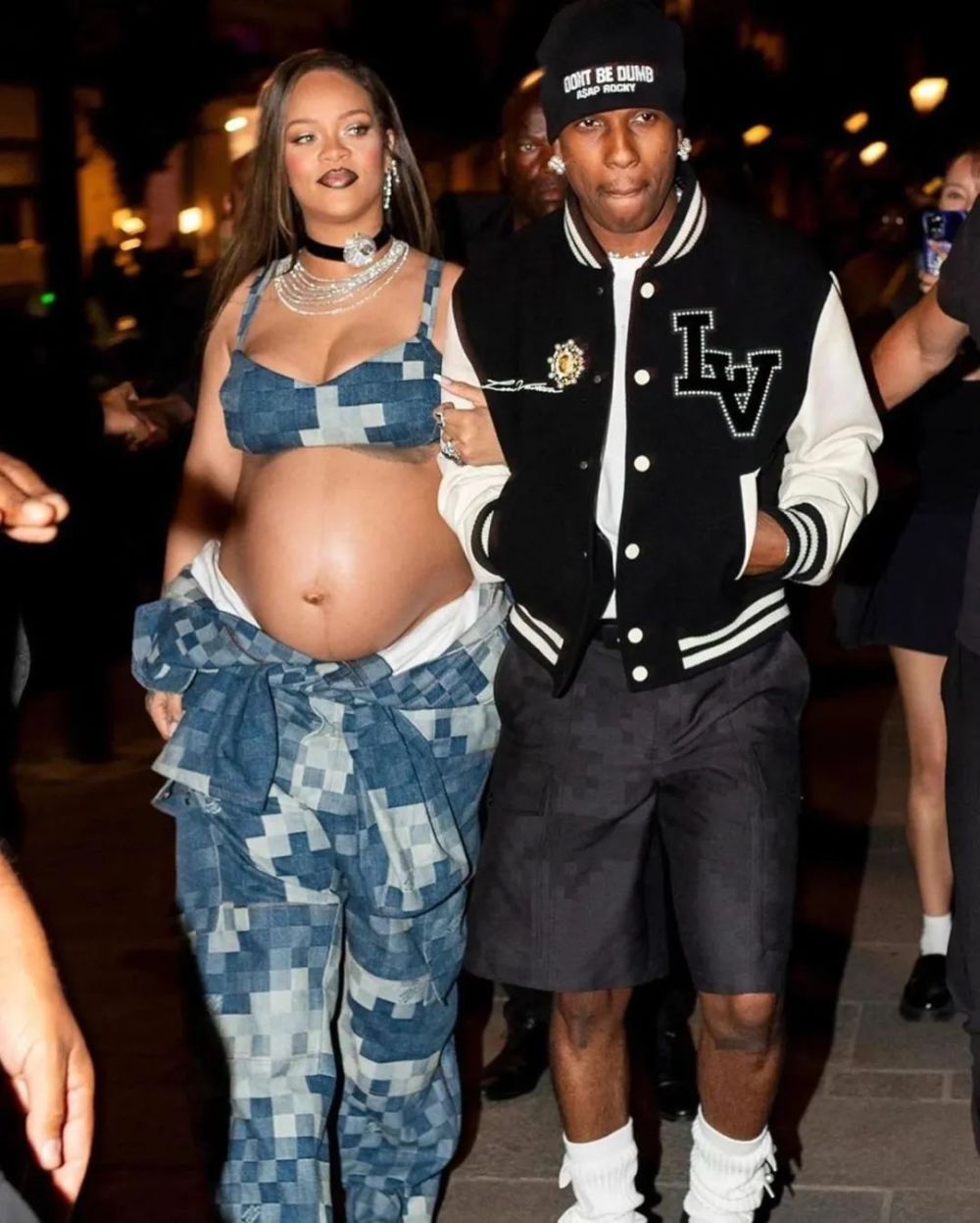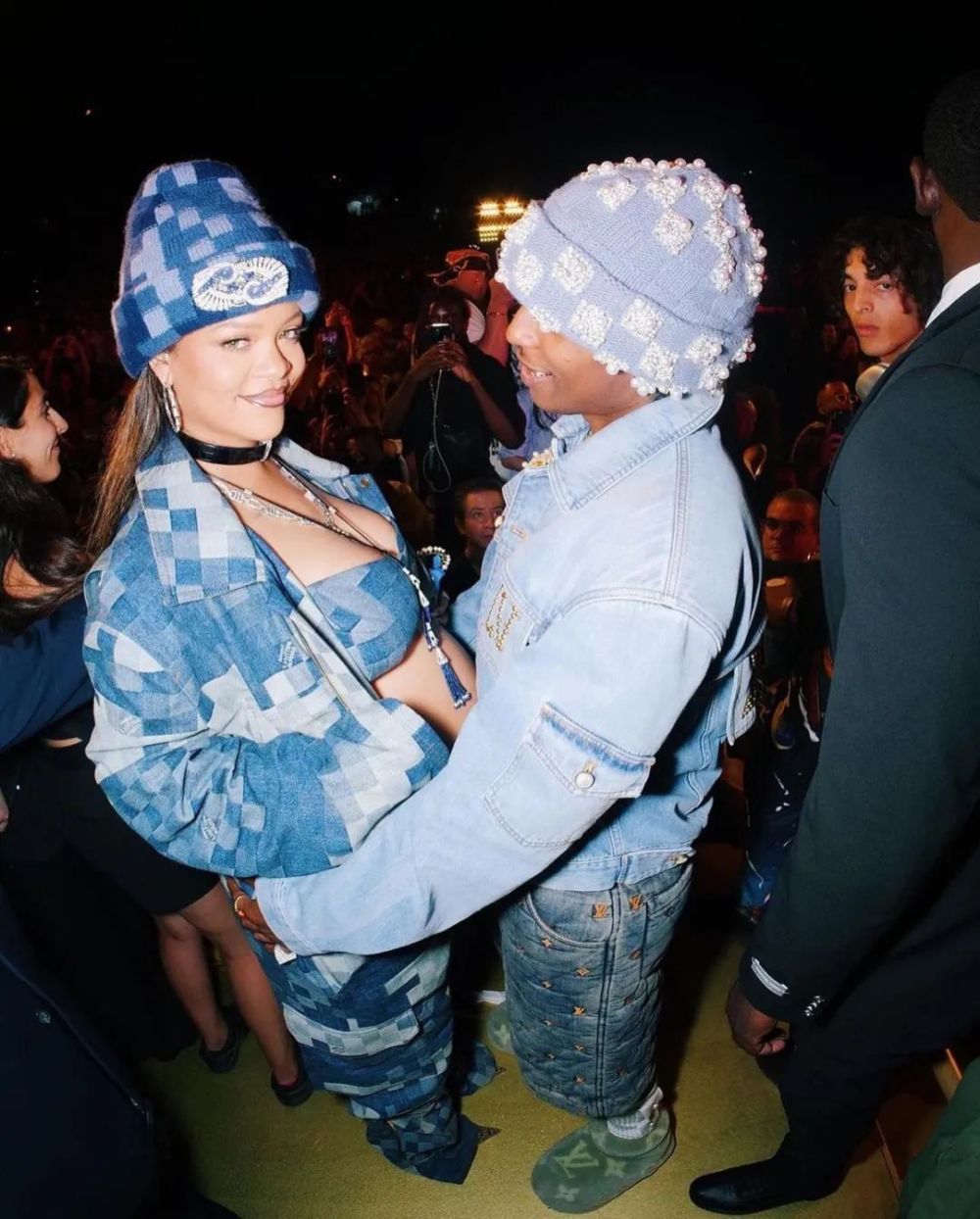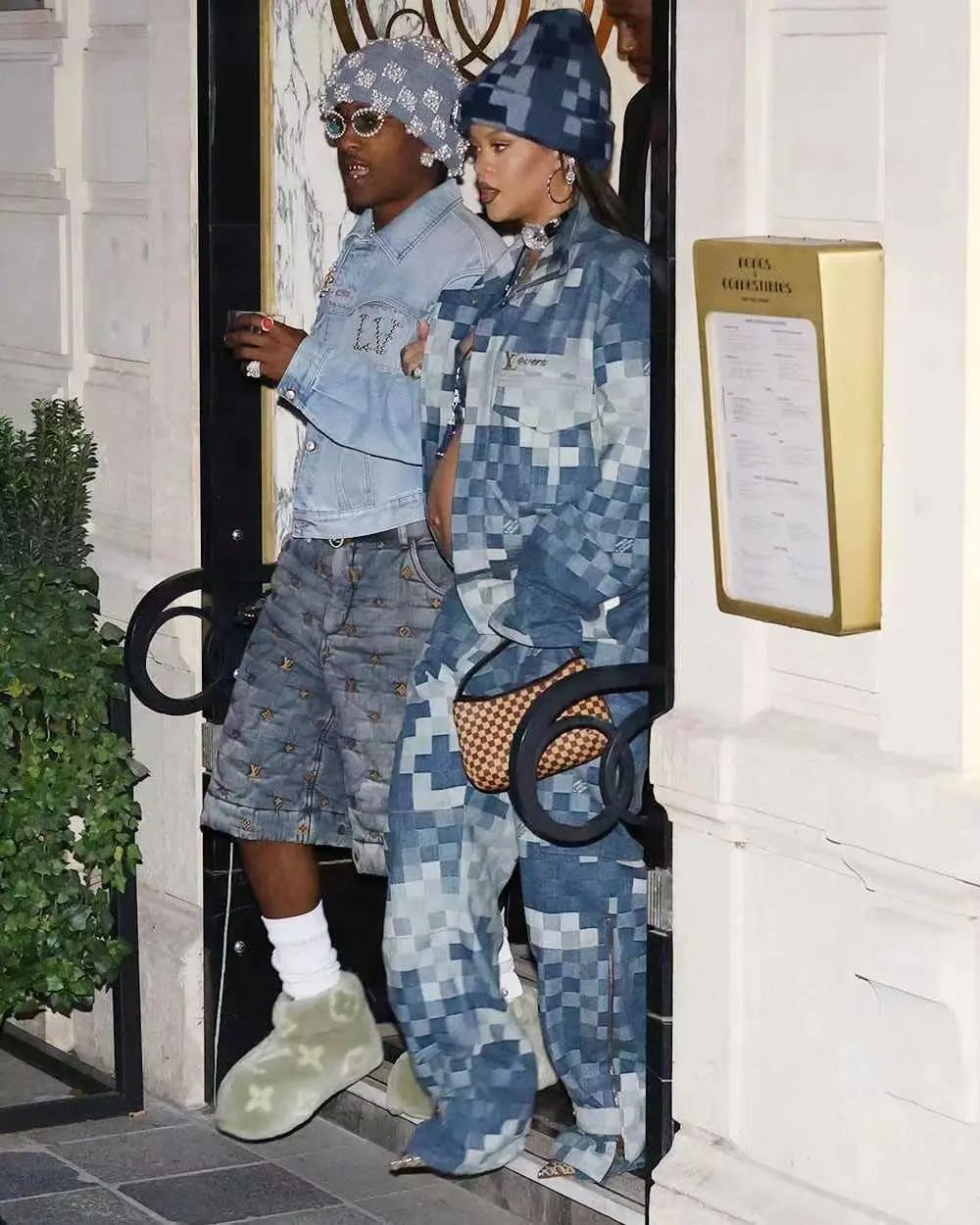 一旁的 A$AP ROCKY 乍看则会低调很多,仅仅以单宁夹克和满印 LV Logo 的单宁短裤示人。
