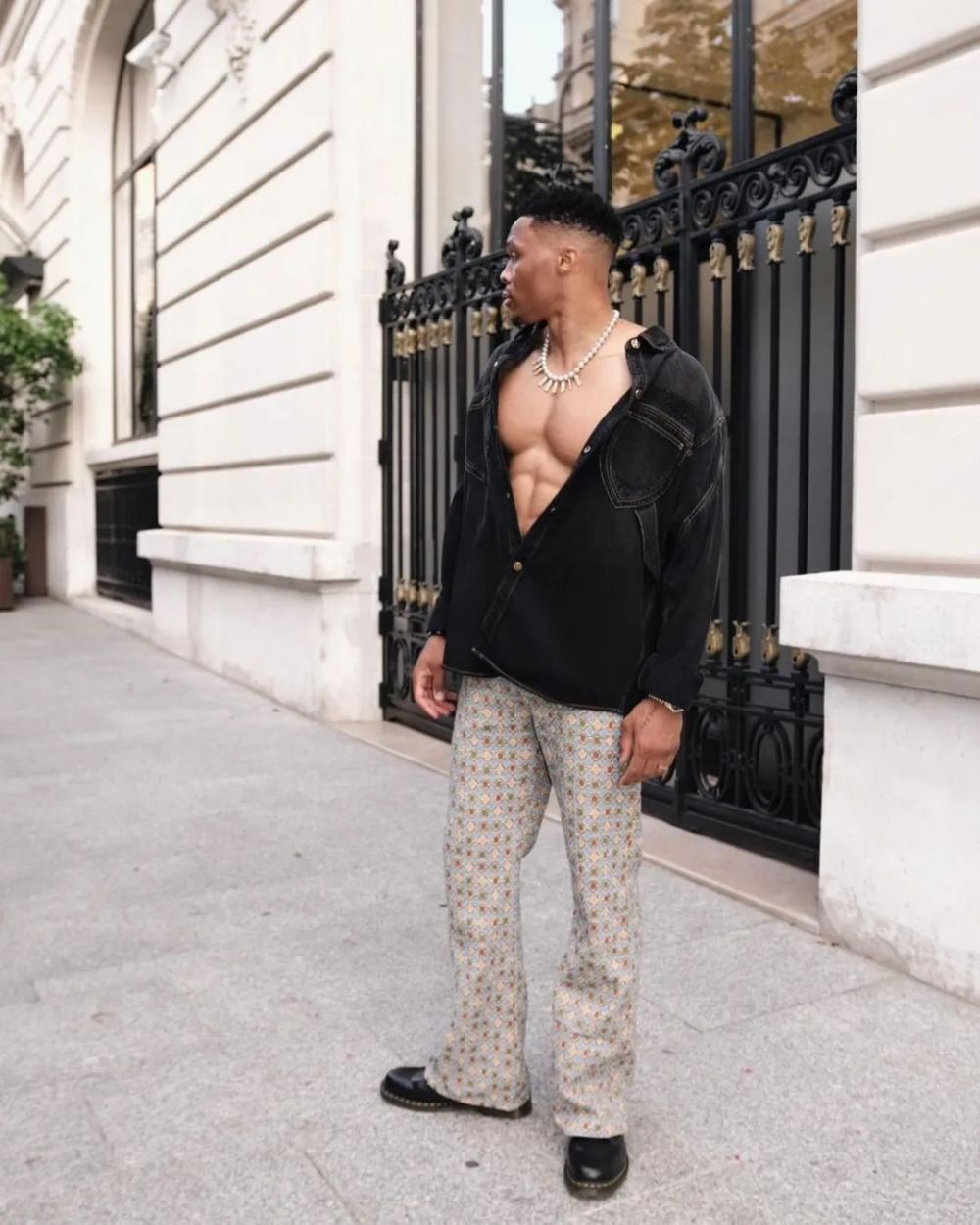 自然威少也没有令大家失望,直接真空上身了一件牛仔夹克,搭配格外花哨的微喇长裤,十分火辣。