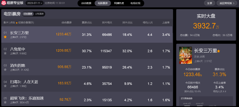 截至发文时间(7月11日上午11时30分),从“猫眼专业版”实时数据显示可知,当前热映电影票房榜前五分别如下: