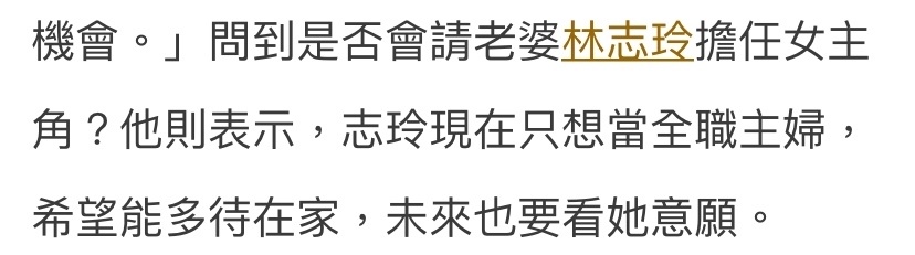 另外,媒体也向他询问老婆林志玲未来还能否复出娱乐圈,Akira透露:志玲现在只想当全职主妇,希望多待在家中,未来也要看她意愿。