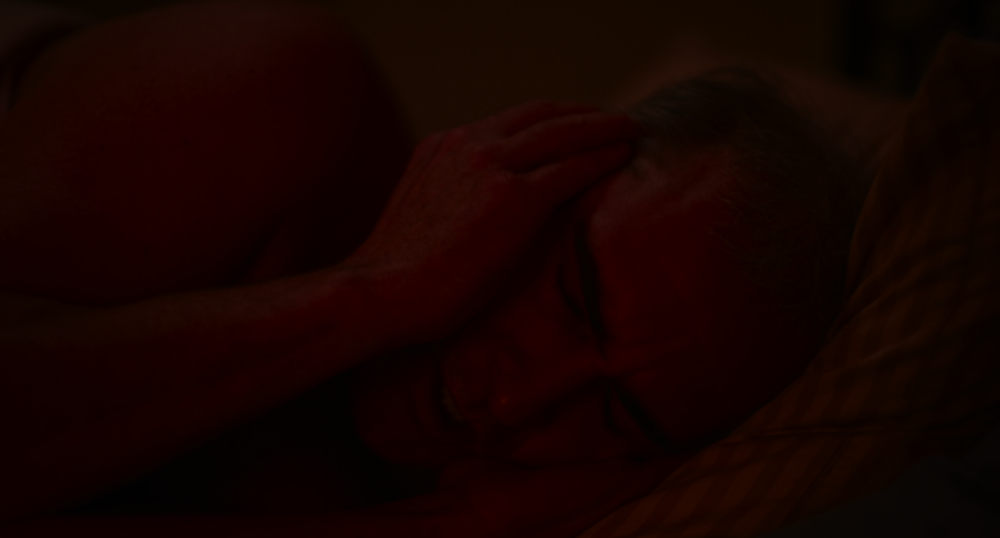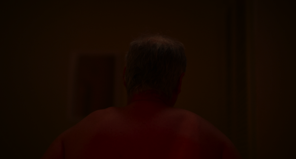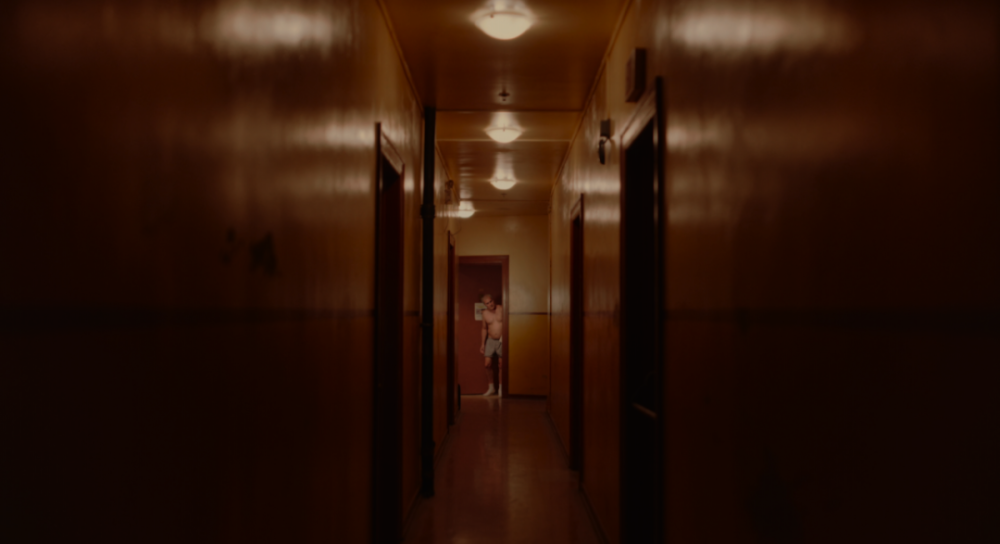 紧随其后的室内情节和调度,进一步加强了博对于外界的不安全感。当他在午夜被惊醒后,暗红色的灯光让他显得疏离且神经高度紧张。当然,逼仄的门框式构图又进一步暗示了博无法逃离的困境。
