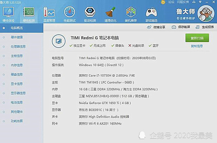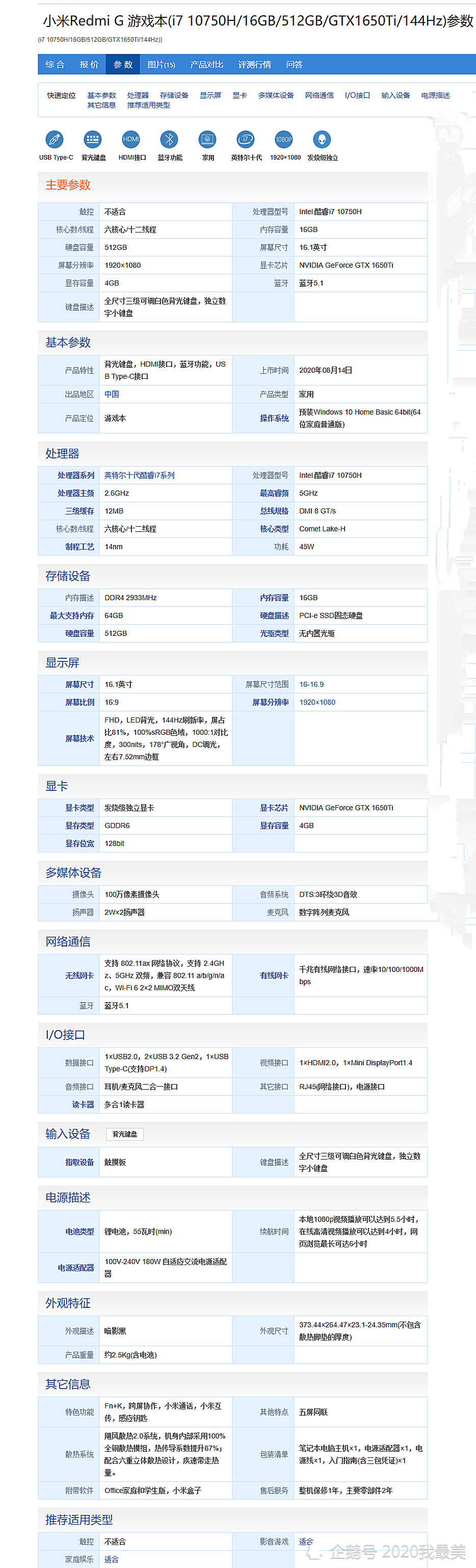 从配置参数可以看出Redmi G打载6核12线程处理器i7 10750H,显卡搭配的是主流处理器GTX1650Ti。这种强强组合让Redmi G可以畅玩市面上的大众及3A游戏。
