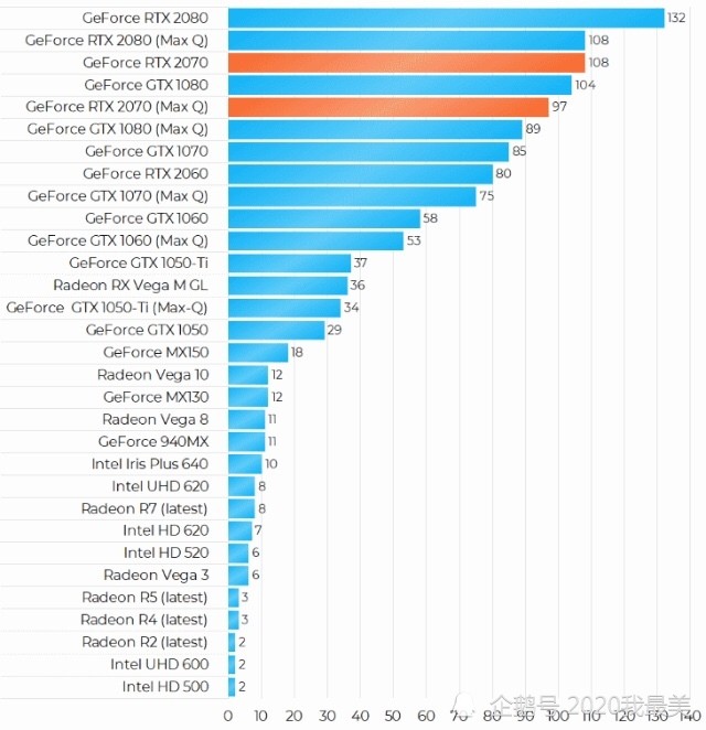上图是2020年Nvidia GeForce RTX 2070 Max-Q的排名情况。高端处理器加发烧级显卡的强强组合,把惠普暗影精灵6打造成了一款高端游戏本。