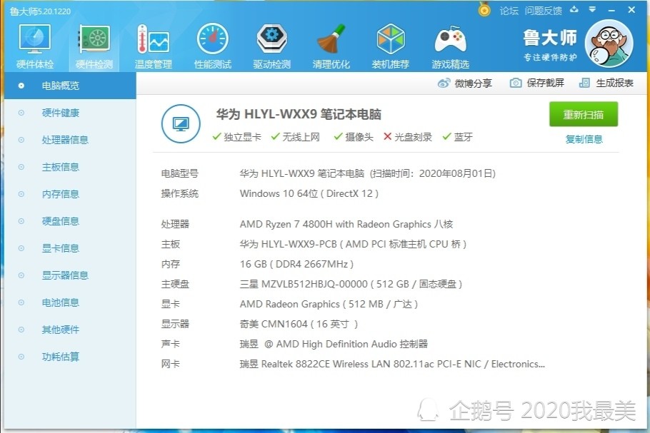 从配置参数可以看出华为Matebook 13 2020锐龙版搭载AMD的6核12线程R7 4800H处理器。显卡为集成核显,经过测试R7-4800H的核显性能强于独显MX250的性能。