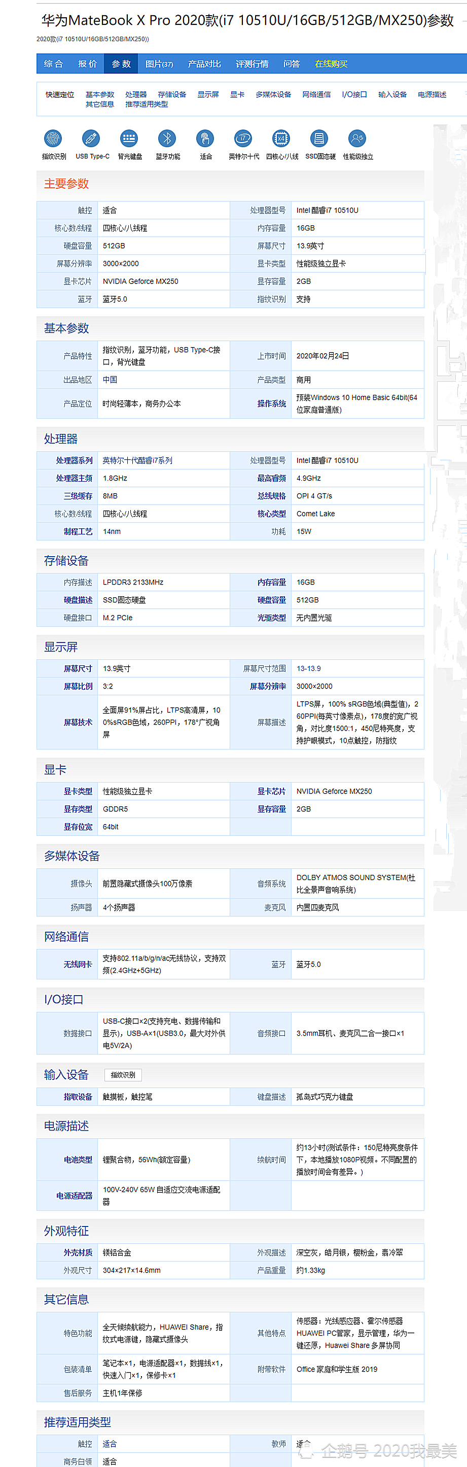 通过配置参数可以看出MateBook X Pro 2020搭载了十代酷睿i7-10510U处理器,显卡搭配独立显卡MX250.