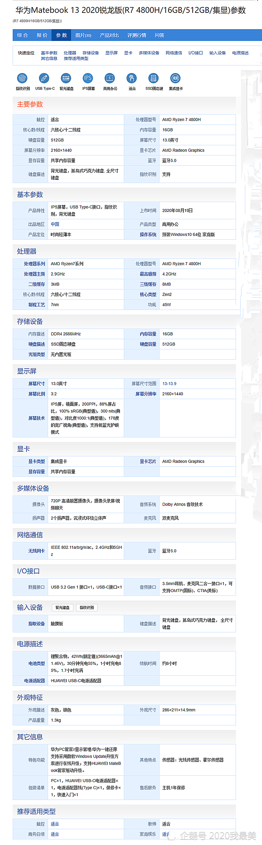 第六款:华为Matebook 13 2020锐龙版(R7 4800H/16GB/512GB/集显)【参考价:5399元】