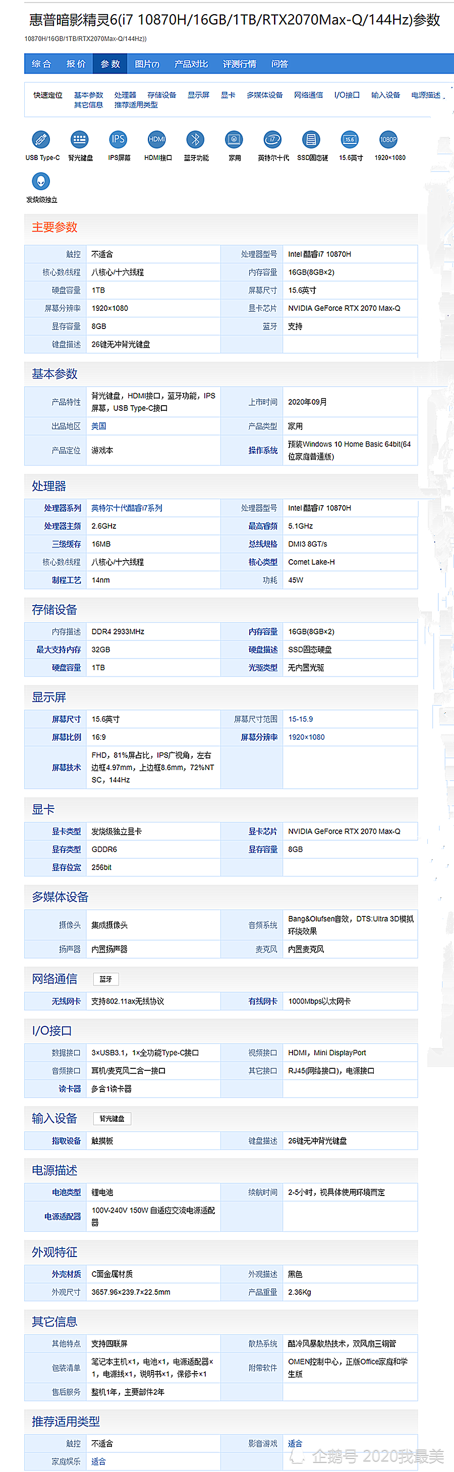 第七款:惠普暗影精灵6(i7 10870H/16GB/1TB/RTX2070Max-Q/144Hz)【参考价:9899元】