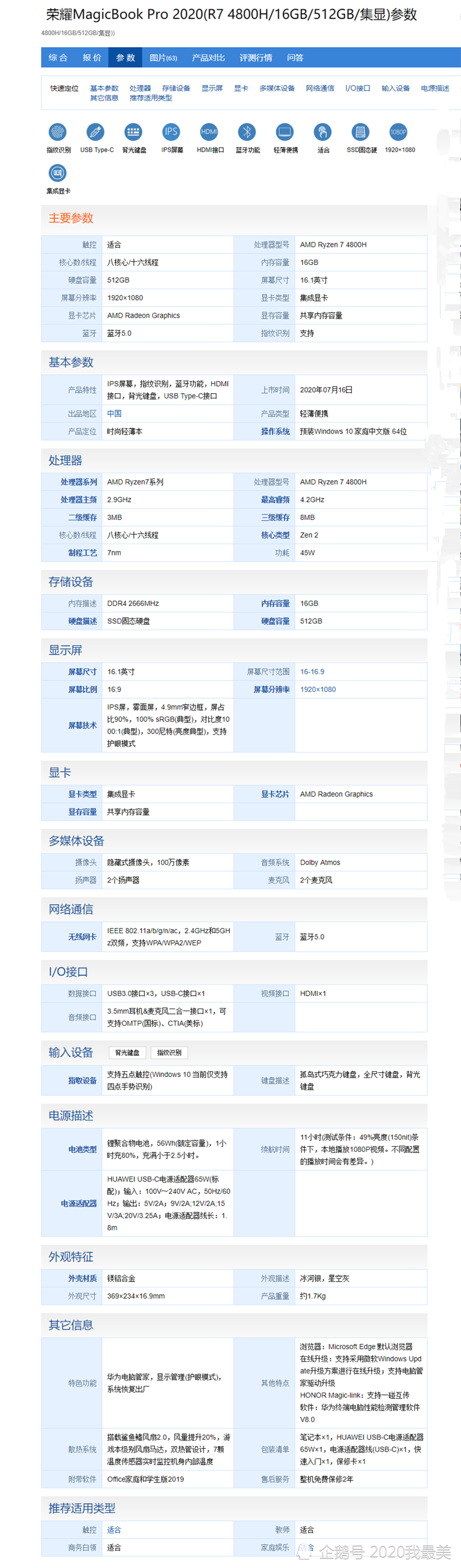 从配置参数可以看出,荣耀MagicBook Pro 2020锐龙版搭载AMD的八核十六线程R7-4800H处理器,显卡为集成核显。