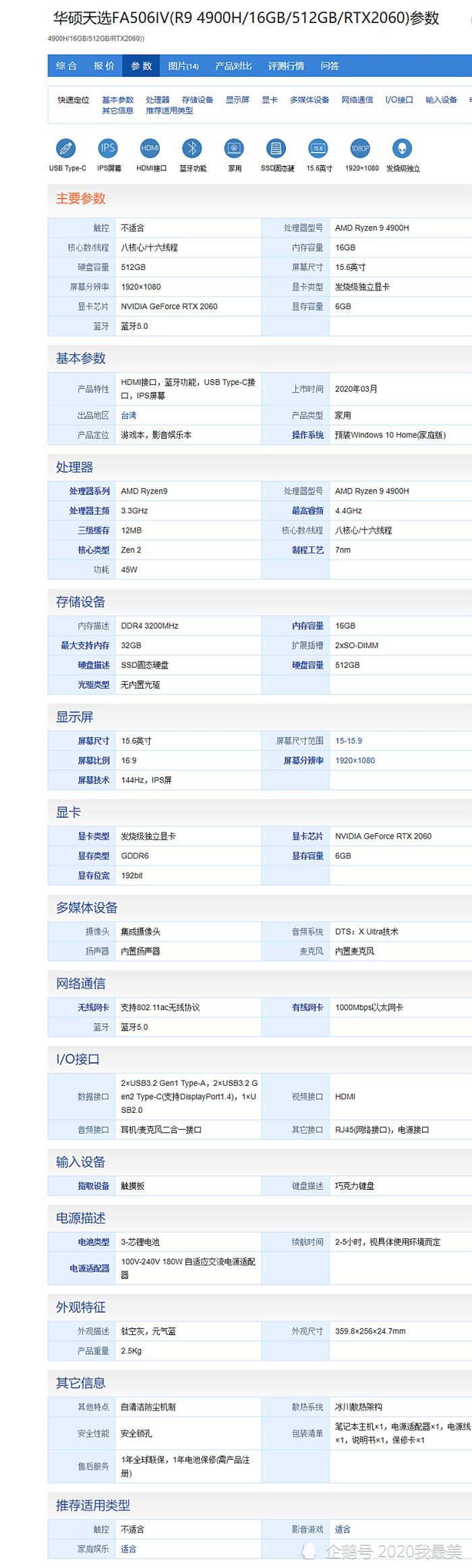 通过配置参数可以看出,华硕天选搭载了AMD的八核十六线程R9-4900H高端处理器,并搭配主流显卡RTX2060。高端的硬件组合把华硕天选打造成了一款综合性能超强劲游戏本。