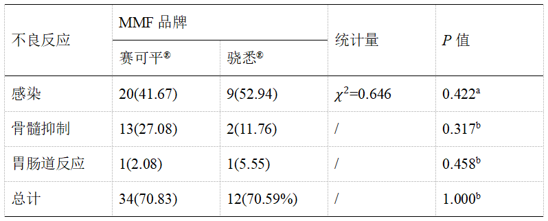 针对本研究纳入的65例患者,如表5所示,赛可平?组和骁悉?组在吗替麦考酚酯治疗期间中分别有41.67%和52.94%的患儿发生感染(P=0.422),27.08%和11.76%的患儿发生骨髓抑制(P=0.317),2.08%和5.55%的患儿出现胃肠道反应(P=0.458)。两组间的总不良反应发生率均无显著性差异(P>0.05)。