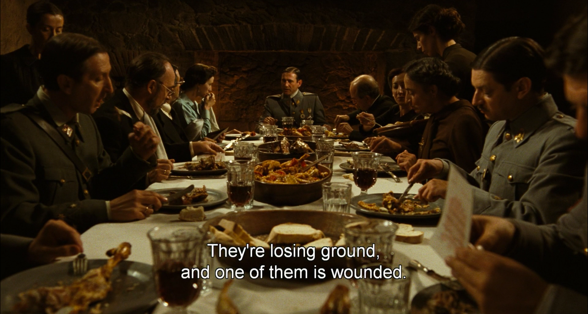 —上尉就是小女孩的第二个考验里的无眼食孩妖,这一点导演在摄影上给予了很多对应关系。在前后两场铺满美食的宴会中,上校和无眼食孩妖都坐在同一位置上。