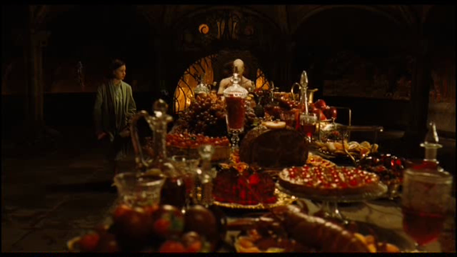 桌子上的美味佳肴就象征了独裁者从百姓那里所搜刮的金银财宝。这也是为什么潘神和三个小精灵阻止女主角吃桌上的美食———当你吃下这民脂民膏的时候你会失去你的纯洁性,降到和妖魔鬼怪一样的水平了。