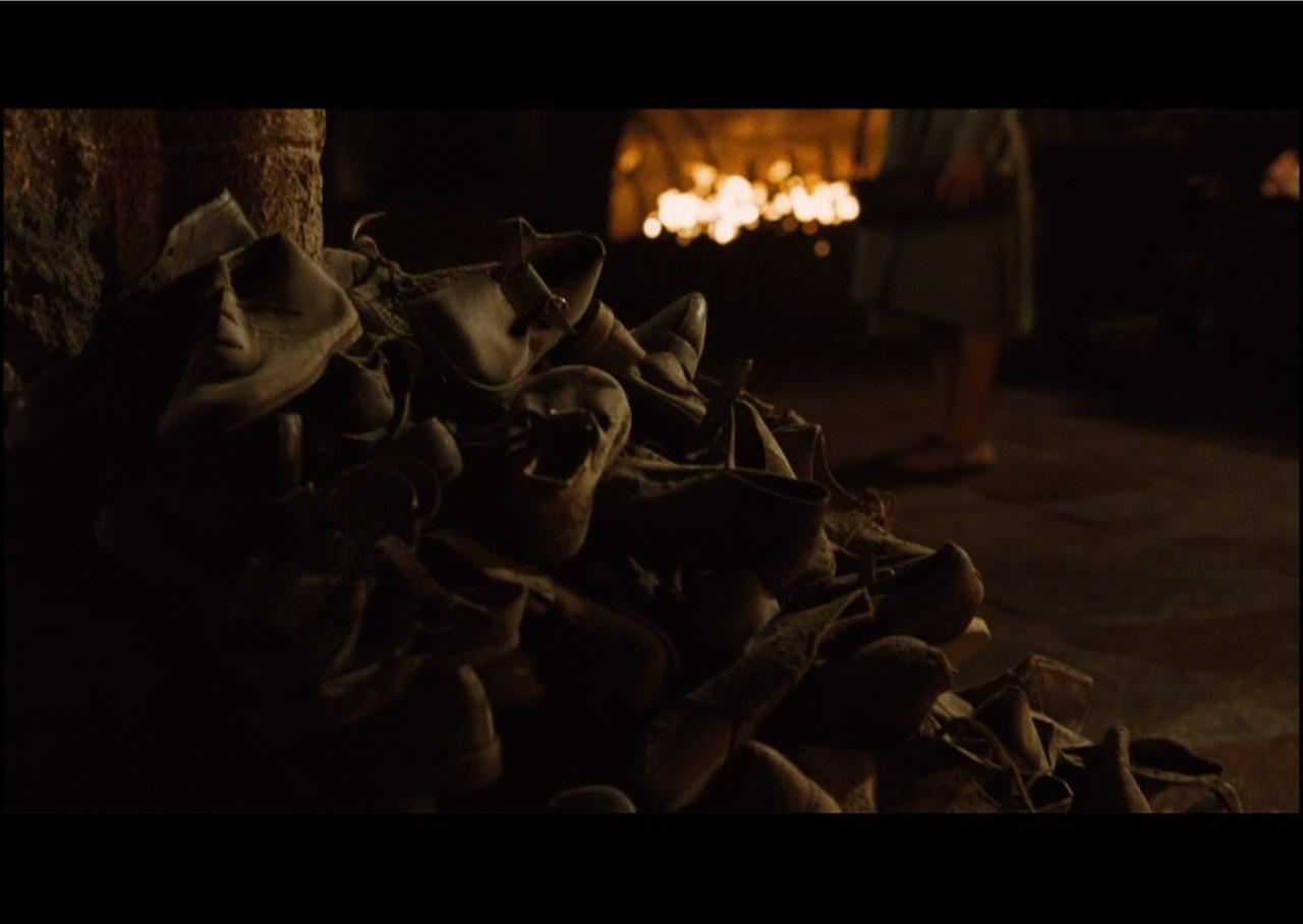 这个场景最直观的解释是食孩妖吃过很多孩子。考虑到故事的背景,我们也可以联想到纳粹德国对犹太人和异见分子的屠杀,联系到集中营那成堆成堆遇难者的遗物。食孩妖象征了法西斯政权对无辜百姓的迫害。我们还可以从另一个角度分析:或许小女孩不是第一个被潘神找来完成任务的孩子,这些是她的前任的遗物,那么这一堆鞋子也可以被解读成数百年来前赴后继的革命烈士。值得玩味的是,他们如果都是在偷吃食物后才被食孩妖所杀,那么他们失败的原因就是被利益腐蚀,没能坚持原有的理想吧。