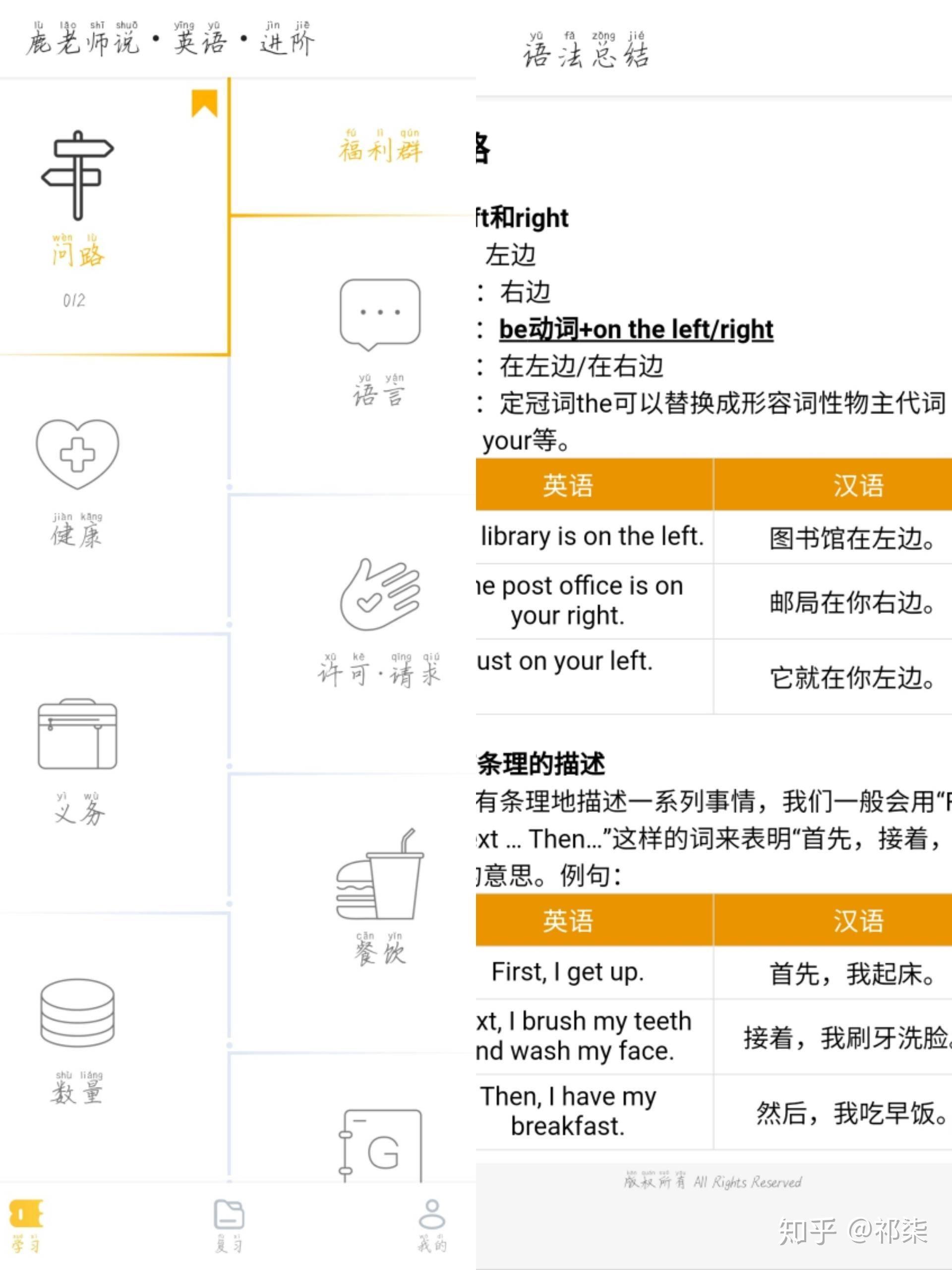 3、他将语法学习穿插在你的课程中,而且每课开始都有一个语法总结,我们可以先熟悉语法内容后再开始闯关学习。语法总结一般以简单且贴合生活的方式来举例并以表格的形式呈现出来,这样不仅可以帮助我们理解和记忆而且更清晰和直观,有助于我们整理自己的笔记。