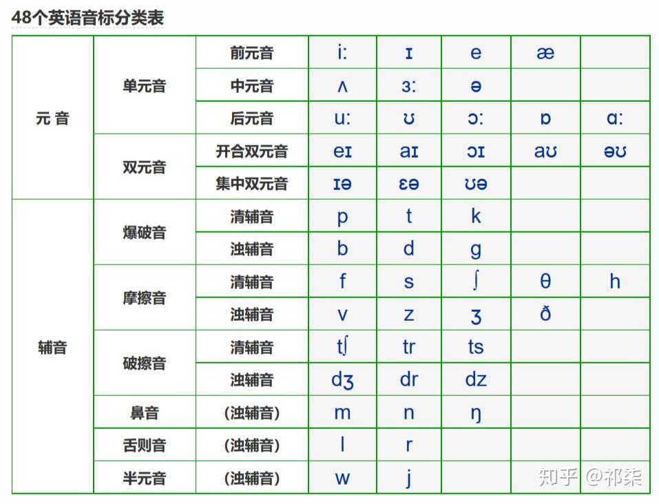 英语共有48个音标,分元音与辅音两大类。元音有20个(12个单元音,8个双元音),辅音有28个。