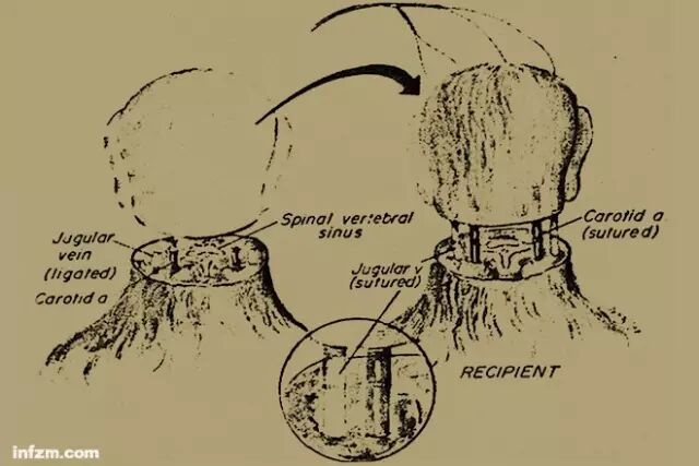 那么头颅移植真的有可能吗?实际上,医学界对头颅移植的尝试早就开始了。1908年5月21日,美国芝加哥的医生古斯里(Charles Guthrie)进行了有文字图片记录的第一例狗头移植。他将一只狗的头切下来,移植到另一只狗的颈部下方,将血管肌肉吻合,使得这只狗有了两个头。血管吻合后,接受移植的狗的血液通过血管进入移植来的狗头,传入大脑,然后回到接受移植的狗的血液循环。在《血管外科及其应用》一书中,他详细描述了这个手术,并附有照片。照片上一个双头的狗躺在手术床上,新移植的头在脖子下面,上下颠倒,所以看起来两个头的下巴凑在一起,非常诡异。他还记述了移植的狗头出现瞳孔收缩,鼻翼扩张,甚至伸舌头的动作。可惜几分钟后狗头就不动了。移植失败。到了20世纪50年代,移植技术大幅进步,前苏联医生杰米霍夫(Vladimir Demikhov)又开始了狗头移植的尝试。他使用快速缝合血管的血管吻合器,将20只小狗的头分别吻合在了20只大狗的颈部。据他出版的书《生命器官的实验性移植》中记载,这些狗头平均存活了大约2到6天,最长的甚至存活了29天。在书中他详细记录了实验的细节,并附有照片。其中一个是1954年2月24日的实验记录,一只一个月的小狗的头被移植到一只成年牧羊犬身体上。实验记录写道:早上9点,被移植的小狗头开始急切地想要喝水喝奶,而且摆动头部,似乎想从受体的成年狗身上挣脱出去;晚上10点30分,当大狗准备睡觉时,小狗头咬了实验员的手指,导致出血。2月26日晚上6点,小狗头咬了大狗的耳后,大狗大叫并猛烈摇头。而据1959年12月9日的《华盛顿邮报》报道,中国人在1959年完成了第一例完全的狗头移植,将一只狗的头移植到了另一只没有头颅的狗身体上。但其中的细节已不可知。前苏联医生杰米霍夫的狗头移植尝试,打开了器官移植的大门。在那以后,器官移植技术得到长足进步,免疫抑制剂的使用最终使得心脏、肾脏、肝脏、肺等等器官移植成为可能。而随着这些器官移植的成功,人体头颅移植的想法又冒了出来。1970年3月14日,美国的俄亥俄州克利夫兰的外科医生罗伯特·怀特进行了饱受争议的手术:将一只猴子的头切下来,移植到另一只无头的猴子身体上。据怀特医生的手术观察称,这只换了头的猴子存活了很短一段时间,但还有嗅觉和听觉,能看见周围环境,甚至差点咬了实验员的手。2001年怀特医生又再次重复了猴头移植实验。他称因为移植手术的长足进步,以及低温保存技术和免疫抑制的发展,头颅移植更加可行,“随着外科技术和术后护理的大幅进步,现在是时候考虑在人体进行头颅移植的可能性了”。2002年12月16日,《化学和工业》杂志发表了一篇来自日本栃木県自治医科大学的医生川合述史的移植尝试。他将24只12天的幼鼠的头切下来移植到了成年鼠的大腿上。据论文记载,如果保持低温和血流畅通,移植到大腿上的鼠头可以存活3周之久,小鼠的头还可以正常生长,嘴巴可以动。看起来非常诡异。中国医生也不甘落后。2014年哈尔滨医科大学第二附属医院的任小平博士在《中央神经系统:神经学与治疗》杂志上发表令人瞩目的论文“异体头体重建:小鼠模式”(Allogeneic Head and Body Reconstruction: Mouse Model)。试验中,80只小鼠被断头后,40只的头与另40只的不同毛色的小鼠的身体连接了一起。据论文描述,手术后,18只换了头的小鼠存活了3小时,且能自主呼吸,还能眨眼,心跳也平稳,没有出现脊髓切断后常见的肢体强直。在文章最后,作者任小平写道:“一旦小鼠模式有效性得到证实,我们将进行灵长类动物实验;这些模式将是我们未来进行人体临床试验的关键一步”。这篇论文一出,媒体为之惊呼,甚至有媒体称任小平为弗兰肯斯坦(Frankenstein)。《弗兰肯斯坦》是一部1931年的美国电影,剧中的科学怪人弗兰肯斯坦将不同尸体的躯体部分缝合在一起,合成了一个人,结果发现合成的是一个怪物。