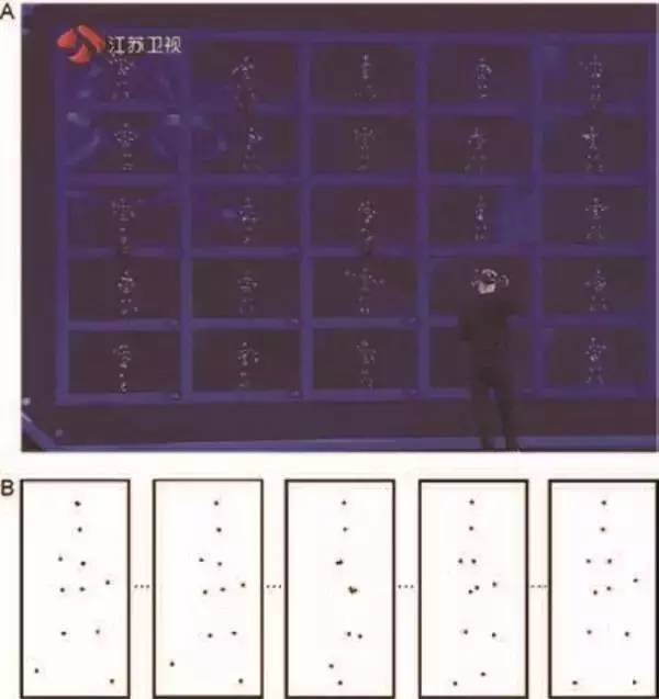 图4 苏清波在“最强大脑”节目中的挑战项目“光点美人”(A);生物运动经典研究中使用的模拟人类行走的光点运动刺激(B)