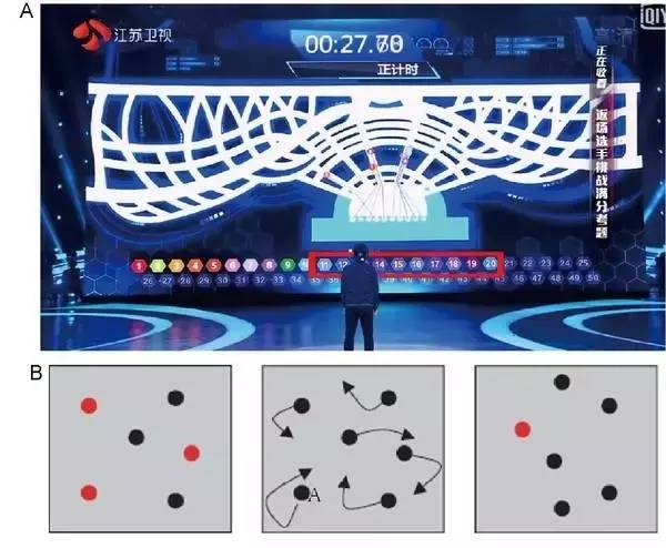 图3 苏清波在《最强大脑》节目中的挑战项目“奔跑的力量”(A);多客体追踪研究中的经典范式(B)