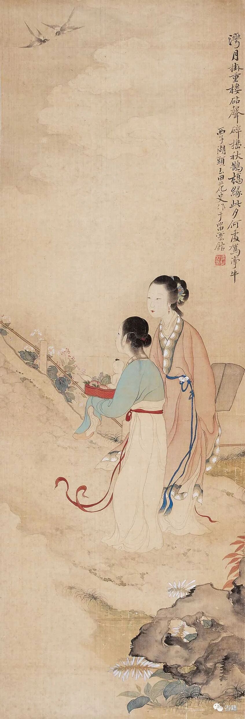 吾乃织女是也。蒙上帝玉敕,与牛郎结为天上夫妇。年年七夕,渡河相见。今乃下界天宝十载,七月七夕。你看明河无浪,乌鹊将填,不免暂撤机丝,整妆而待。〔内细乐扮乌鹊上,绕场飞介〕〔前场设一桥,乌鹊飞止桥两边介〕〔二仙女〕鹊桥已驾,请娘娘渡河。〔贴起行介〕