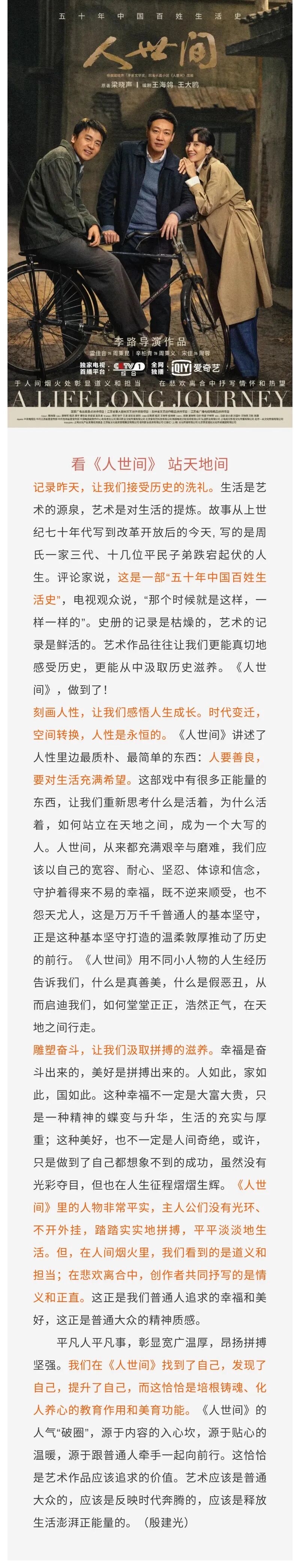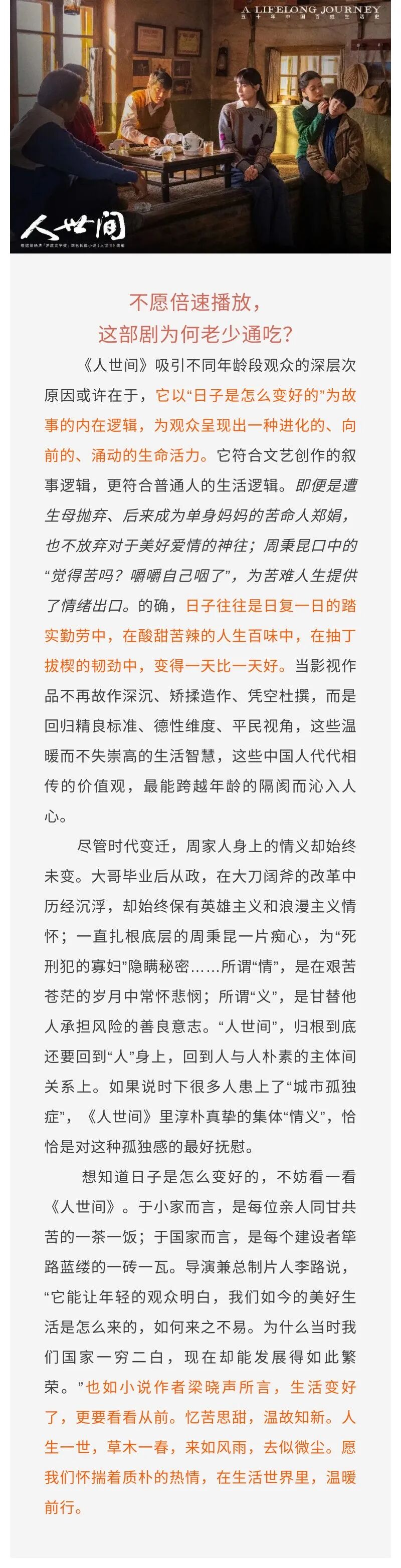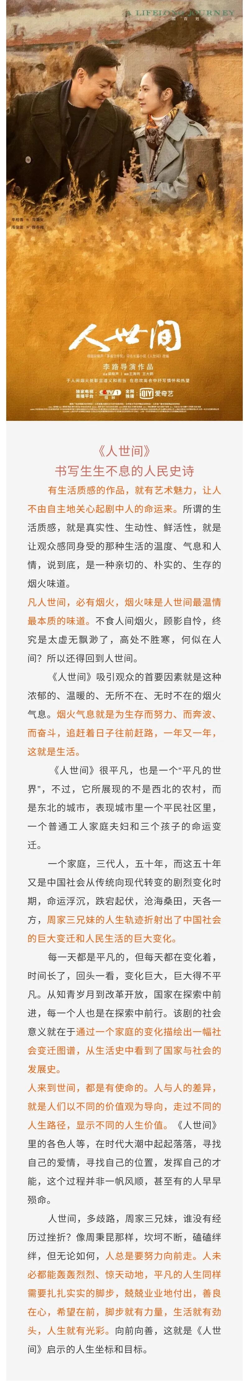 他们在这“人世间”相遇,用文字、镜头、表演述说着中国平民的50年,将中国社会变迁下,老百姓向往与追求美好生活的坚韧、努力娓娓道来。这不仅是一个故事,也是一段人间烟火史。