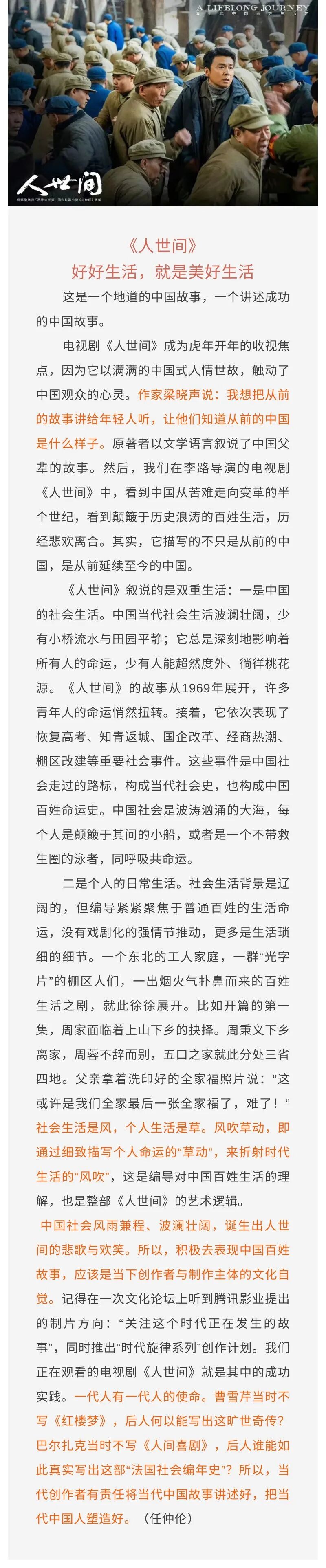 精彩评论读书的价值《人世间》中靠读书逆袭的故事,和作者梁晓声的经历如出一辙。他也出身于贫苦的工人家庭,上山下乡时期当了一名兵团战士。由于爱读书,爱写作,他被兵团推荐到了复旦大学学习,从此改变了自己的人生轨迹。(获取更多高中作文素材请搜索关注微信公众号:作文选刊)直至晚年,梁晓声也一直保持着阅读的习惯,他认为:“读书是最对得起付出的一件事,你多读一本好书,就会对你产生影响。”遍阅群书,是最朴素的高贵,也是成本最低的投资。你在读书上花的时间和心思,都会化作未来某个时刻的惊喜馈赠。那些融入血液的文字,会带你横渡万丈迷津,奔赴一场花团锦簇的前程。良善真义《人世间》放弃了传奇性,以身边人的视角来描写人物传情达义,塑造了可信、可爱、可亲的平凡人形象。周父是新中国第一代建筑工人,这让他骄傲,在三线建设工作的几十年里与家庭聚少离多也无怨言。他有中国式家长的独断和望子成龙的期待,但绝非封建家长。在他的价值体系中判断人的最高标准就是“好人”。因此,当他确认了冯化成和郑娟是“好人”时,便与女儿、儿子冰释前嫌。中国故事《人世间》想要表达的是个人、家庭与群体、城市之间的同构命运。“光字片”是北方吉春市的边缘棚户区,这里有木材厂、酱油厂、拖拉机厂、军工厂等,居住的大多是新中国的第一代工人家庭。这些家庭里,有如周志刚这样的支援三线建设的建筑工人,也有“六小君子”这样的“工二代”,以及周楠、冯玥和周聪这样的第三代。它是光荣与梦想的同义词,也是困惑与艰难的近义词。(获取更多高中作文素材请搜索关注微信公众号:作文选刊)电视剧从1969年周家子女上山下乡为故事起点,逐步展开了共和国50年发展演进的宏伟画卷,其中涉及了上山下乡、三线建设、恢复高考、知青返城、改革开放、反腐倡廉等国家和社会发展的重要节点和事件,而剧中这些工人群体家庭的历史命运也就随之跌宕起伏。这样,光字片就有了极典型的意义,成为了中国城市50年发展的一只“麻雀”,而电视剧也就超越了一般意义上的家庭故事,成为真正意义上的“中国故事”了。家国情怀《人世间》叙说的是双重生活:一是中国的社会生活。中国当代社会生活波澜壮阔,少有小桥流水与田园平静;它总是深刻地影响着所有人的命运,少有人能超然度外、徜徉桃花源。《人世间》的故事从1969年展开,许多青年人的命运悄然扭转。接着,它依次表现了恢复高考、知青返城、国企改革、经商热潮、棚区改建等重要社会事件。这些事件是中国社会走过的路标,构成当代社会史,也构成中国百姓命运史。中国社会是波涛汹涌的大海,每个人是颠簸于其间的小船,或者是一个不带救生圈的泳者,同呼吸共命运。(获取更多高中作文素材请搜索关注微信公众号:作文选刊)二是个人的日常生活。社会生活背景是辽阔的,但编导紧紧聚焦于普通百姓的生活命运,没有戏剧化的强情节推动,更多是生活琐细的细节。一个东北的工人家庭,一群“光字片”的棚区人们,一出烟火气扑鼻而来的百姓生活之剧,就此徐徐展开。比如开篇的第一集,周家面临着上山下乡的抉择。周秉义下乡离家,周蓉不辞而别,五口之家就此分处三省四地。父亲拿着洗印好的全家福照片说:“这或许是我们全家最后一张全家福了,难了!”社会生活是风,个人生活是草。风吹草动,即通过细致描写个人命运的“草动”,来折射时代生活的“风吹”,这是编导对中国百姓生活的理解,也是整部《人世间》的艺术逻辑。(上海电影家协会主席 任仲伦)家庭幸福家庭是中国社会生活的微型标本,蕴藏着中国人的生活哲理和情感。你写好一家人,打动的是千家万户。周家的故事是全剧的叙说轴心,创作者放弃家庭人设的奇思异想,而是忠实于普通家庭的基本人设。父亲朴实而传统,对儿子严苛,对女儿宠爱。最后却让女儿踩痛了心,踩痛了也爱着,典型的中国父亲。母亲贤惠而顾家,大儿子周秉义有志向且能担当,二女儿周蓉义无反顾而柔情坚韧,小儿子周秉昆憨厚庸常却能竭尽孝心。这是中国人熟悉的家庭成员,就像左邻右舍,就像自己的家。虽然那个年代常常突出“我们”,但只要有个人就有个人的生活欲望。即使是一个大家庭,彼此间冲突与吵架,成为生活的常态。周蓉的突然离家,让父亲心痛而绝然;周秉昆似乎是最庸常的,也是最敏感的,为了父亲的“虚荣”而顶撞;为了大哥的“薄情”而吵架。《人世间》把这种家庭人际冲突表现得真实而温暖,其价值核心就是中国家庭的人伦理想。女性魅力《人世间》中的女性群像各有其貌。郑娟是大家最怜爱的角色。同情是人们最愿意付出的情感。她几乎是苦难的化身,降落在尘埃之中,或者说,就是生活中的一颗尘埃。苦难是她生活的本色,她本能地去承受而不扭曲灵魂。(获取更多高中作文素材请搜索关注微信公众号:作文选刊)“我不值得”,是她对自己的认识,也是对别人的提醒,她担忧连累别人,但她绝不担忧拖累自己,尤其是面对周秉昆的情感。周秉昆与她第一次相遇,导演用镜头渲染出郑娟娇柔且惶恐,让周秉昆的保护欲砰然而出。随着剧情发展,周秉昆读懂了她的最内心:不为低微而屈从生活,却因为善良而牺牲自我,这是人性中最美丽的光芒。(上海电影家协会主席 任仲伦)父辈记忆作为一部志于讲述“五十年中