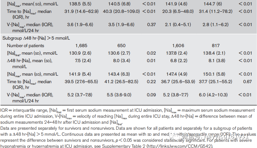 2011 年 1 月至 2017 年 4 月期间,125,876 名患者入住参与的 ICU,其中,共有 36,660 名患者(29%)被纳入分析(图 1)。通常在入院后 24-48 小时(n = 32,976)没有血清钠数据或因为钠是通过间接 ISE 测量(n = 50,603)而被排除在分析之外。表 1 中提供了排除患者的基线特征。入住 ICU 时,497 名患者 (1.4%) 有严重低钠血症,8,068 名 (22.0%) 有轻度低钠血症,25,965 名 (70.8%) 有正常钠血症,2,130 (5.8%) 名有高钠血症。总体而言,与非幸存者相比,幸存者更年轻,合并症更少,APACHE-IV 评分更低,ICU 住院时间更短。[Na] 优先,Δ48 小时-[Na],整个 ICU 期间的最大血清钠测量表 3 和表 2 显示了入院([Na]max)时间到 [Na]max 的时间,以及在整个 ICU 住院期间达到 [Na]max 的速度。在因轻度低钠血症、正常钠血症或高钠血症入院的患者中,未存活者的平均 Δ48 hr-[Na] 和 [Na]max 更高。院内死亡率与 Δ48 hr-[Na](主要分析)之间的关联是如图 1 所示。在入住 ICU 时出现严重低钠血症 (< 125 mmol/L) 的患者中,血清钠的增加与较低的死亡率相关(Δ48 hr-[Na] 5-10 mmol/L 比值比 [OR] , 0.49 [95% CI, 0.29-0.83]; ?48 hr-[Na] > 10 mmol/L OR, 0.43 [95% CI, 0.25-0.74])。在所有其他患者中,血清钠的增加与较高的死亡率相关。对于入住 ICU 时轻度低钠血症 (125-135 mmol/L) 的患者,对于 Δ48 小时-[Na] 5-10 mmol/L,院内死亡率的 OR 为 1.10(95% CI,0.97-1.25),对于大于 10 mmol/L 的 ?48 hr-[Na],OR 为 1.17(95% CI,0.92-1.49)。结合最后两个类别,对于入院时轻度低钠血症且 ?48 hr-[Na] 大于 5 mmol/L 的患者,死亡率的 OR 为 1.11(95% CI,0.99-1.25)。对于血钠升高过快的患者,血清钠和住院死亡率的增加可能是独一无二的,我们还分析了死亡率与 Vmax-Δ[Na] 之间的关联,即第一次测量的血清钠之间的最高增加速度ICU 入院和入院后 24 小时至 48 小时内进行的任何血清钠测量(图 2)。在轻度低钠血症患者中,2.5-5 mmol/L/24hr (OR, 1.07 [95% CI, 0.88-1.30])、5-7.5 mmol/L/24hr (OR, 1.14 [95% CI, 0.93-1.40])、7.5-10 mmol/L/24hr (OR, 1.02 [95% CI, 0.83--1.27]) 和大于 10 mmol/L/24hr (OR, 1.17 [95] % CI,0.99-1.38])。在入院时血钠正常的患者中,所有 Vmax-Δ[Na] 组的血清钠增加与死亡率之间存在关联,Vmax-Δ[Na] 越高,OR 值越高。在入院时患有高钠血症的患者中,Vmax-Δ[Na] 大于 7.5 mmol/L/24 小时的患者死亡率最高。在入住 ICU 时出现严重低钠血症 (< 125 mmol/L) 的患者中,血清钠升高最快的患者的死亡率 OR 最低。表 3 给出了整个 ICU 入住期间血清钠水平的描述(针对轻度低钠血症和正常钠血症入院的患者)和表2(所有患者入院时均包括严重低钠血症或高钠血症)。对于轻度低钠血症入院的患者,[Na]max 的第 75 个百分位数分别为 144 mmol/L 和 147 mmol/L,对于幸存者和非幸存者。存活者和非存活者之间在入住 ICU 期间达到最大血清钠浓度的比率没有差异。在 2,335 名入住 ICU 时出现轻度低钠血症且 ?48 hr-[Na] 大于 5 mmol/L 的患者中,86 (3.6%)(图 2,3)在入住 ICU 期间发展为重度高钠血症(> 155 mmol/l) ,其中 40 人死亡(46%)。共有 2,423 人在入住 ICU 时血钠正常,Δ48 hr-[Na] 大于 5 mmol/L。在这些患者中,313 人 (12.9%) 在入住 ICU 期间出现严重高钠血症 (> 155 mmol/L),其中 177 人 (56.0%) 死亡。对于因血钠正常而入院的患者,幸存者和非幸存者的 [Na] max 的第 75 个百分位数分别为 150 mmol/L 和 154 mmol/L。与幸存者的 7.7 mmol/L/24hr 相比,75% 百分位数的非幸存者达到 [Na] max 的速率更高。Δ48 hr-[Na] 与住院期间有或者没有脑内疾病的入院后死亡率相似,如入院原因所示(图 2 和图 3)。