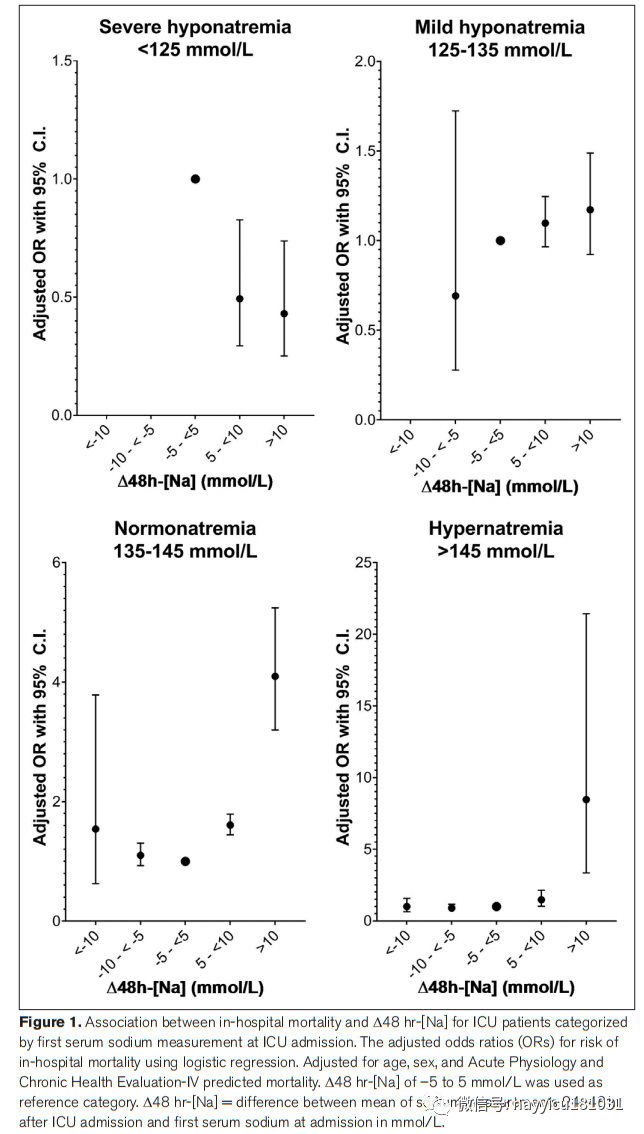 测量及主要结果:采用校正年龄、性别和急性生理和慢性健康评估- iv预测死亡率的logistic回归模型,评估ICU入院后24-48小时的平均钠值与ICU入院时首次血清钠值(?48小时-[Na])和住院死亡率之间的差异。共纳入36660例患者进行分析。血钠水平升高与正常血钠血症患者住院死亡风险升高独立相关(?48 hr-[Na] 5-10 mmol/L比值比:1.61[1.44-1.79],?48 hr-[Na] > 10 mmol/L比值比:4.10[3.20-5.24])和高钠血症(?48 hr-[Na] 5-10 mmol/L比值比:1.47[1.02-2.14],?48 hr-[Na] > 10 mmol/L比值比:8.46[3.31-21.64])。入院的轻度低钠血症患者(?48 hr-[Na]大于5 mmol/L时,住院死亡率无显著差异(比值比为1.11[0.99-1.25])。