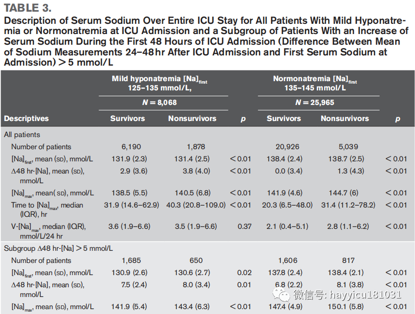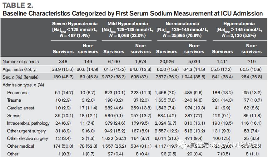 结论:在入住ICU后48小时内,血钠升高患者相比较正常钠血症患者以及高钠血症患者而言,前者住院死亡率较高。
