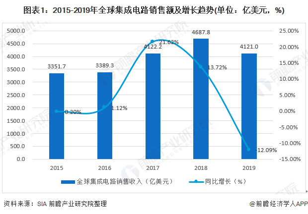根据全球半导体协会SIA发布的年全球半导体市场报告显示,在持续的全球贸易动荡和产品价格周期性等因素的综合作用下,2019年全球集成电路销售大幅下降至4121亿美元,同比下降12%,。但在2019年下半年,全球市场有所反弹,从第三季度到第四季度略有增长,预计到2020年将有适度的年增长率。