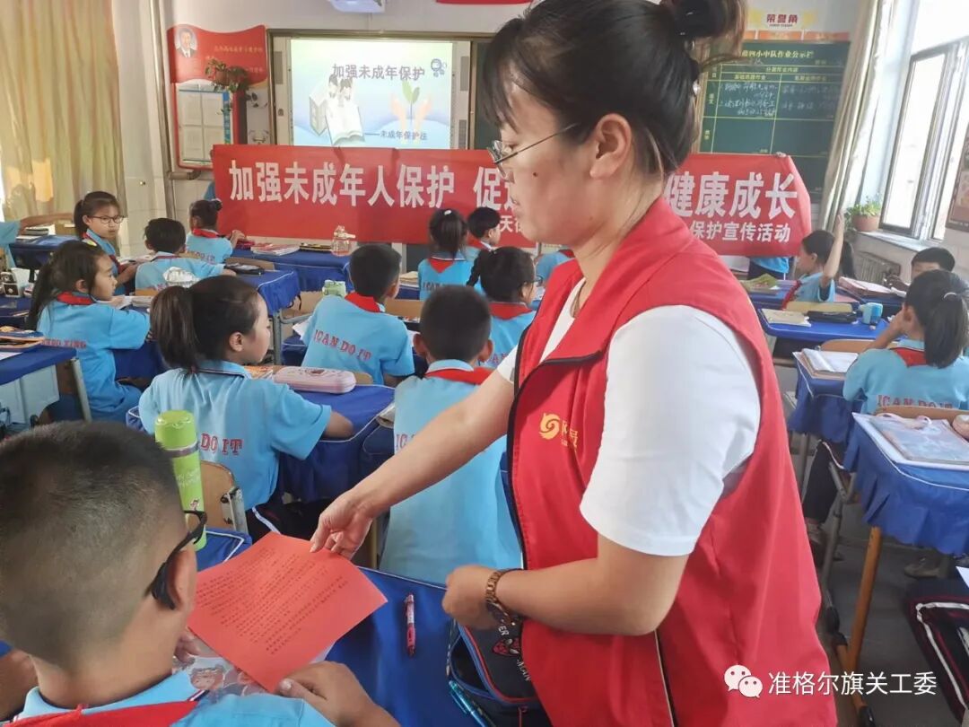 为了切实做好未成年人保护宣传工作,提高未成年人的自我保护意识,促进未成年人的身心健康、快乐成长,6月27日张家塔社区关工委干事走进薛家湾第四小学开展“加强未成年人保护,促进未成年人健康成长”宣传活动。