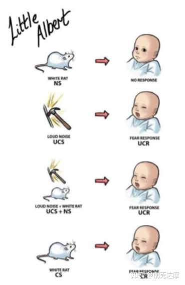 华生通过增加钢轨敲击巨响来使得原本不怕小白鼠的小艾伯特最后惧怕小白鼠,以及其他毛茸茸的事物。