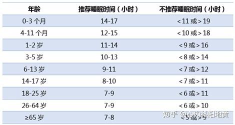 各个年龄段建议的睡眠时间[11]:0~3 个月 每天 14~17 小时,考虑个体差异也不宜短于 11 小时或长于 19 小时[12]4~11 个月 每天 12~15 小时,考虑个体差异也不宜短于 10 小时或长于 18 小时1~2 岁 每天 11~14 小时,考虑个体差异也不宜短于 9 小时或长于 16 小时3~5 岁 每天 10~13 小时,考虑个体差异也不宜短于 8 小时或长于 14 小时6~13 岁 每天 9~11 小时,考虑个体差异也不宜短于7小时或长于 12 小时14~17 岁 每天8~10小时,考虑个体差异也不宜短于 7 小时或长于 11 小时18~25 岁 每天 7~9 小时,考虑个体差异也不宜短于 6 小时或长于 11 小时26~64 岁 每天 7~9 小时,考虑个体差异也不宜短于 6 小时或长于 10 小时65 岁和更老 每天 7~8 小时,考虑个体差异也不宜短于 5 小时或长于 9 小时