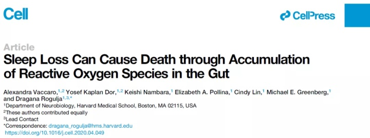 2020 年,美国哈佛医学院的神经科学家在果蝇、小鼠等动物身上发现了睡眠不足致死(例如连续十天以上的睡眠剥夺造成的猝死)与肠道的因果关系,相关研究结果发表在 2020 年 6 月 4 日的 Cell 杂志上: