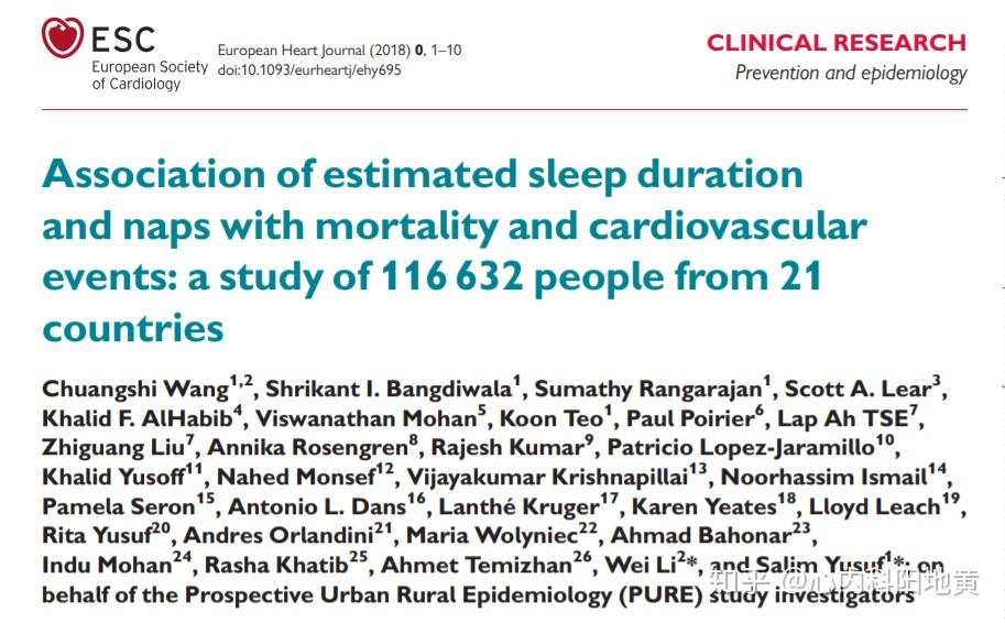 比如这一篇,2018年12月发表在心血管内科顶级期刊European Heart Journal上的文章。这篇文章纳入了来自21个国家、116632人,来自美国睡眠协会的权威专家们,将所有参与者的每日总睡眠时间分为≤6小时、6-8小时、8-9小时、9-10小时、>10小时共5组进行比较,比较的指标是这些人群心血管疾病的发生率和死亡率。