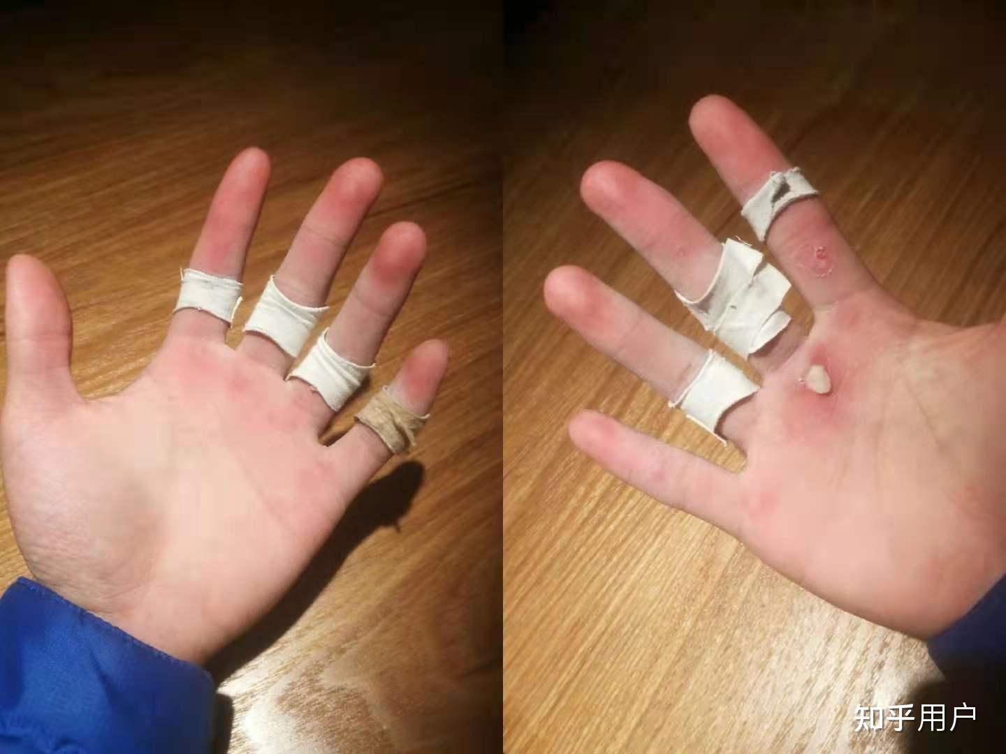以前不撸铁不健身,手皮嫩,第一次攀岩爬得猛,完了手皮全部被磨破