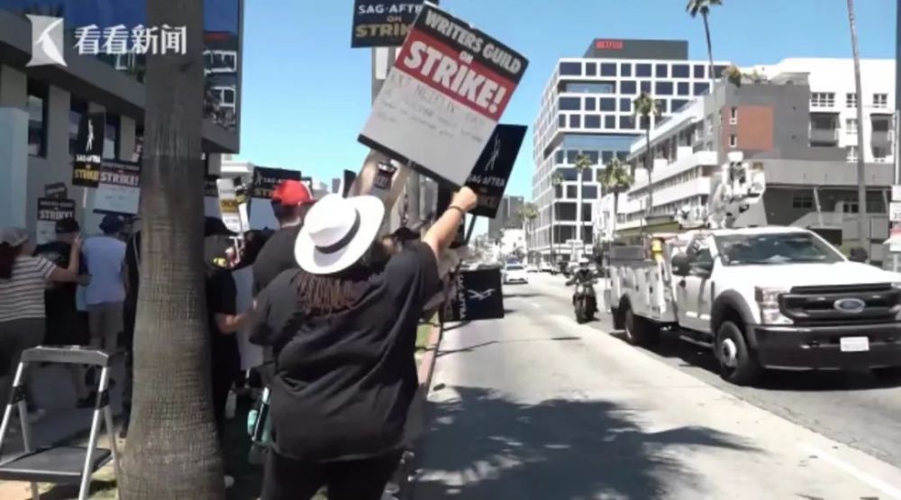 位于洛杉矶日落大道的流媒体公司奈飞,华纳兄弟、派拉蒙影业的办公楼外,都聚集了大批抗议者。人们手举印有工会标志以及罢工字样的牌子游行,过往司机鸣笛以示支持。