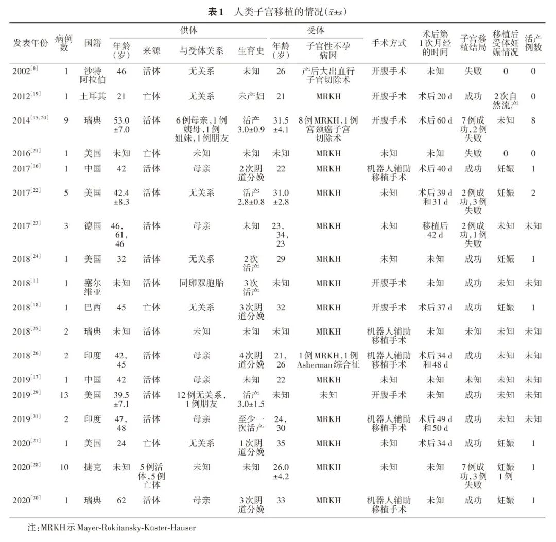 前期大规模动物实验证实了子宫移植技术的可行性,科学家们将目光放在了渴望妊娠的子宫性不孕患者身上。2000年人类首次子宫移植是在沙特阿拉伯进行的,令人遗憾的是术后由于严重并发症而被迫摘除了移植的子宫,手术虽最终没完全成功,但验证了人类子宫移植的可行性,取得了突破性进展[8]。2013年一名先天性子宫缺失的患者在瑞典接受了子宫移植手术,捐赠者是一位绝经后妇女。术后患者恢复良好并成功妊娠,通过剖宫产成功诞下一名健康男婴。这是世界上报道的首例子宫移植后成功活产,为子宫移植治疗子宫性不孕症提供了直接证据,并且证实来自绝经后供体的活体子宫移植是可行的[15]。2015年西京医院成功实施了中国首例人子宫移植手术,这也是世界第12例,该手术的成功实施标志着我国在该领域取得关键性进展;随后该患者成功诞下一名健康男婴,这是中国第1例、全球第14例在移植子宫内孕育出生的婴儿,他的出生不仅给研究人员极大鼓舞,而且为众多子宫性不孕女性带来生子希望[16]。2017年西京医院又顺利完成全国第2例人子宫移植,新移植子宫成活良好[17]。2018年巴西报道了世界上首例利用死亡供体进行子宫移植并成功活产,这极大拓展了供体来源[18]。从2000年人类子宫移植开始至今,多个国家(沙特阿拉伯、瑞典、美国、印度、捷克、中国等)共开展子宫移植手术56例,其中6例来自绝经后供体,83.9%(47/56)都来自活体供体,受体中有40例都是因为先天性子宫异常导致的子宫性不孕症;在这些病例中移植手术成功44例,分娩16例[1,8,15-31],详见表1。