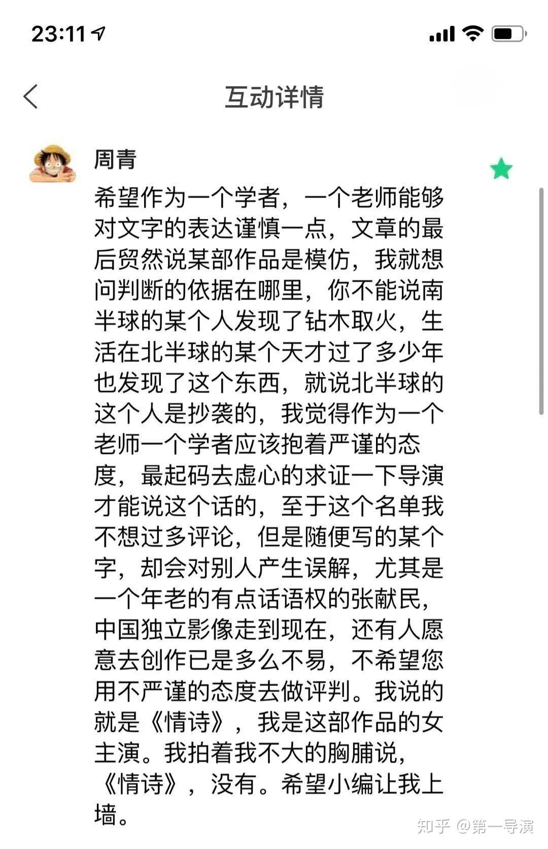 原因是,我们当天推荐了张献民老师的第二届“十荐”片单:2020年第一篇新导演十佳片影评,今晚我用文字取代观影。那篇文章里,张献民老师认为《情诗》在创作上涉及到模仿。