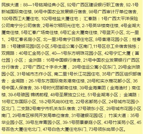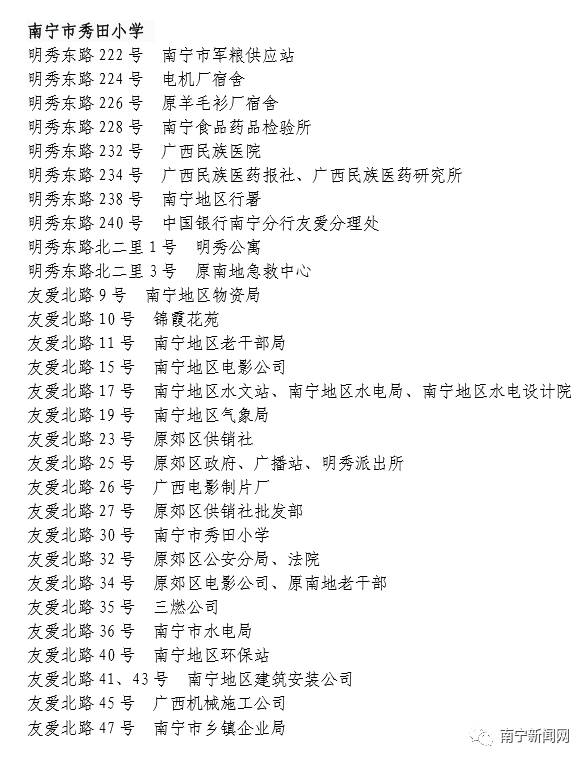 民族大道:108凤岭雅苑小区(国家税务局宿舍区),110号东林阁小区,118号石门森林公园职工宿舍,120号皇巢世家职工宿舍,126号龙滩红河花园、南宁基地职工周转房大楼;青秀路:8号崇左交警支队小区,10号天广和花园,12号中国电信宿舍区,16号美路庭园, 16-1号青秀花园,16-2号右江花园,18号大自然花园;越秀路:1号天昌凯悦国际,2号鑫龙小区(区农行金融小区),3龙曦山庄,5号山水方园,6号广西专用通信局,7号倚林佳园、金盛时代;会展路:6号广西区实验幼儿园,9号远辰.山水1号小区,区政府青秀小区;竹溪大道:66号区物价局干部职工住宅,82号秀湖苑,86号广源国际社区,88号南宁市中级人民法院职工宿舍,96号龙盘小区;青湖路:9号广西药检宿舍;竹秀路:14号璧秀宛,16号俍园小区。