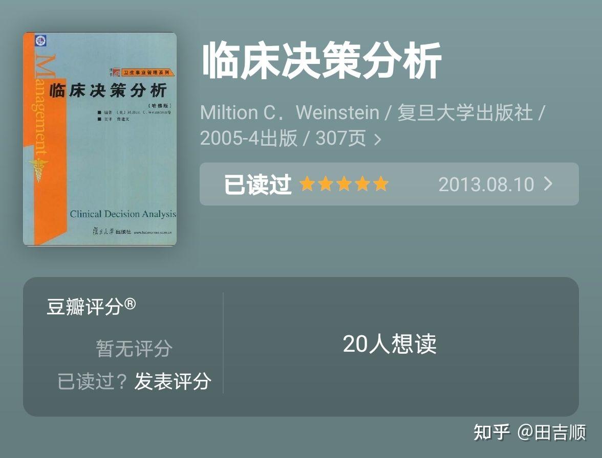 这本《临床决策分析》,是国外教科书的翻译,从循证医学思想,到临床决策过程,都讲解的特别详细。印象最深的,是其中关于临床决策树概率赋值,以及贝叶斯定理的部分,让当时的自己感觉思路大开,对工作帮助太大了。