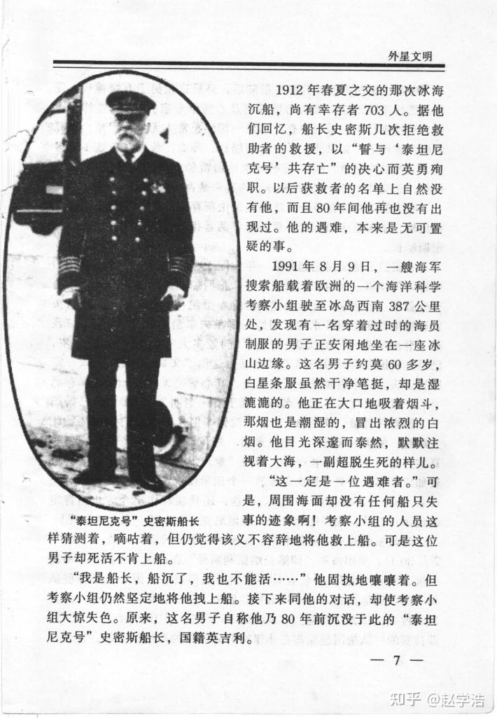 再比如第二篇《穿行“时空隧道”》,讲述的是“泰坦尼克”号的女乘客和史密斯船长,在八十年后先后获救的故事。